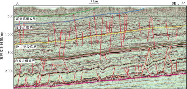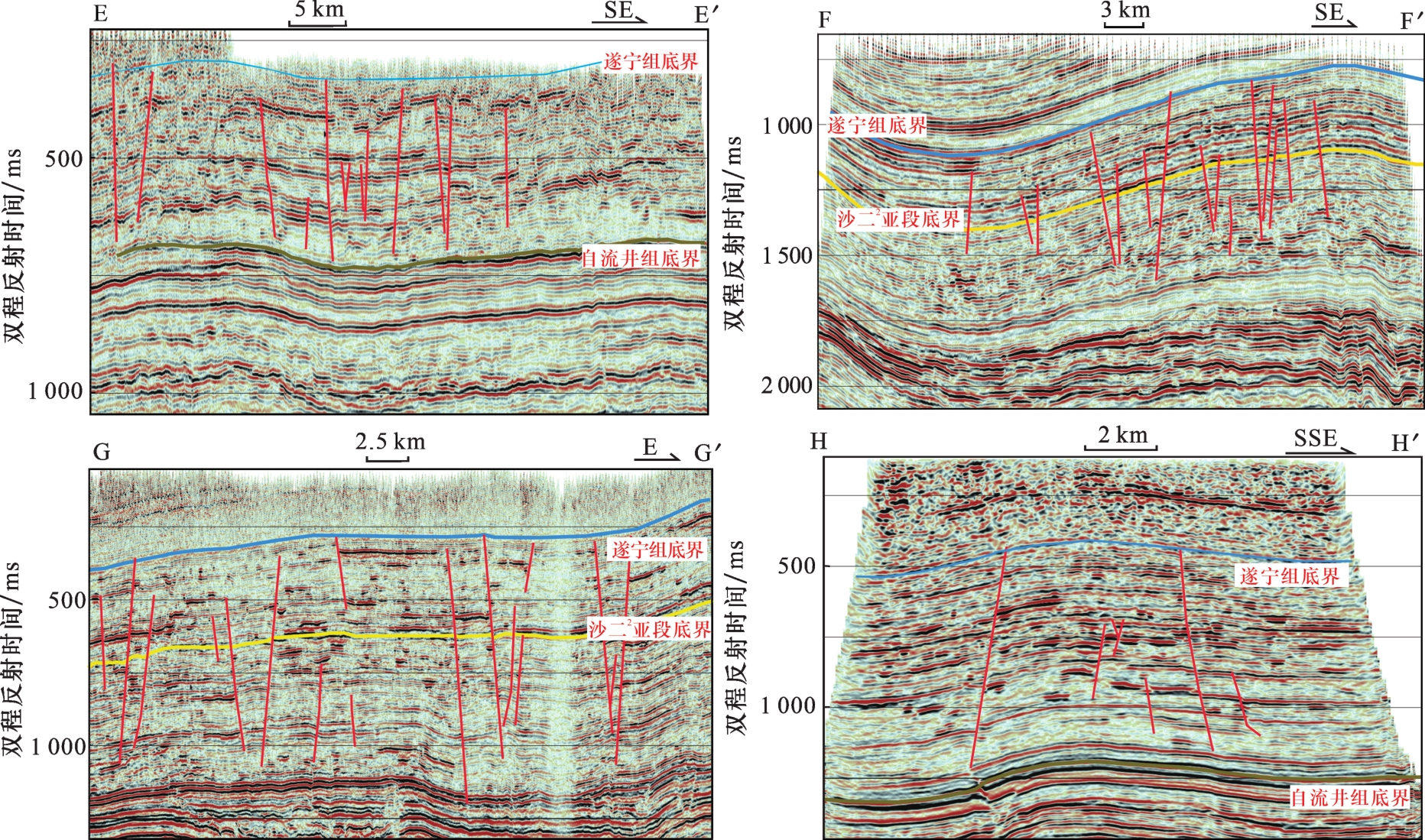 图3 龙岗地区SE向三维测线断层解释结果Fig.3 Interpretation result of SE direction 3D seismic section in Longgang area |