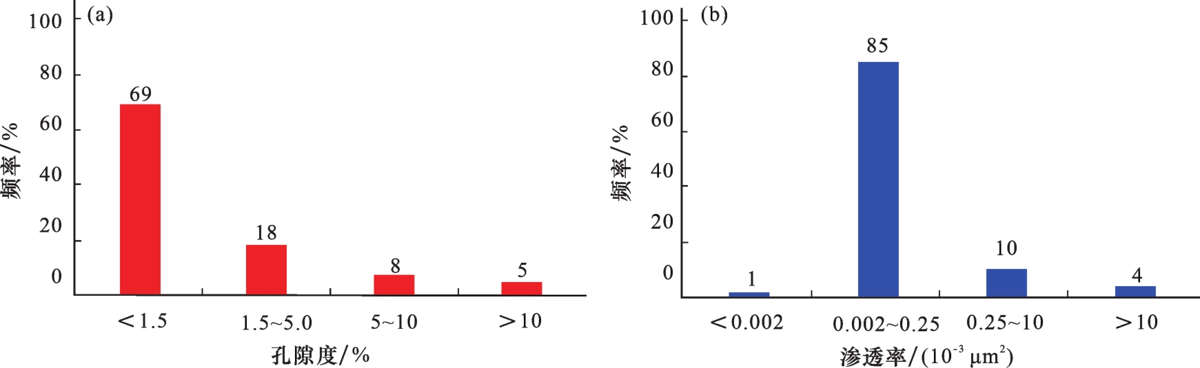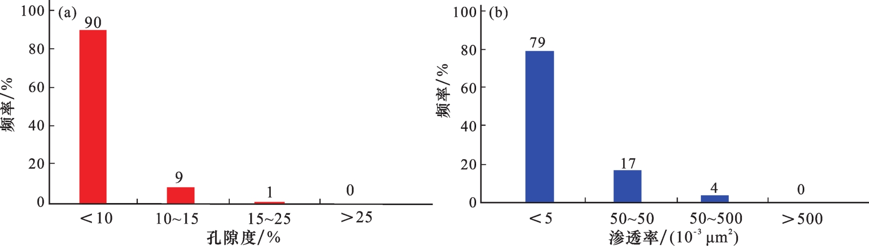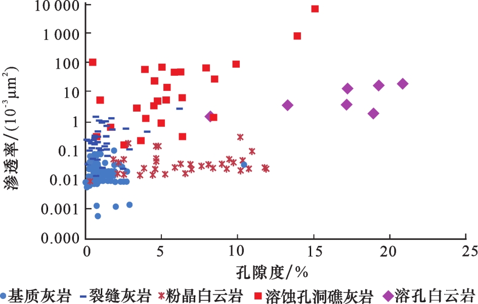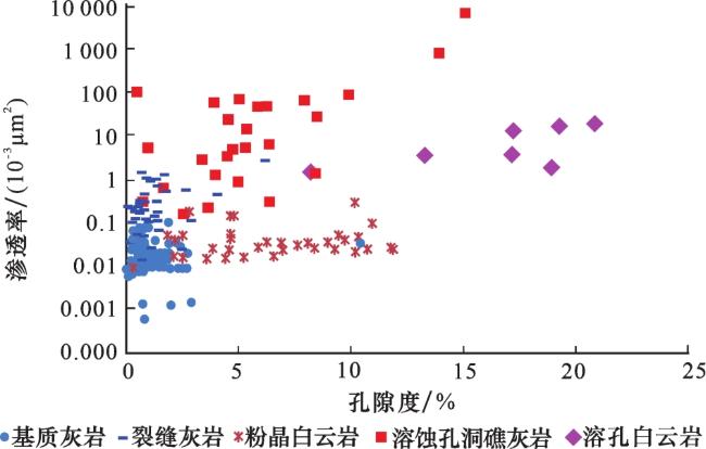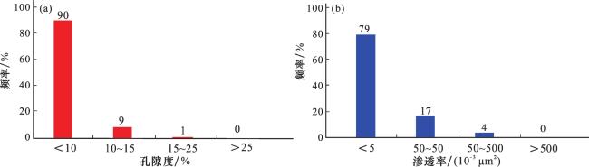 图4 苏克气田下石炭统碳酸盐岩储层孔隙度和渗透率分布直方图Fig.4 Distribution histograms of carbonate reservoir porosity and permeability of Lower Carboniferous in Sozak Gas Field |