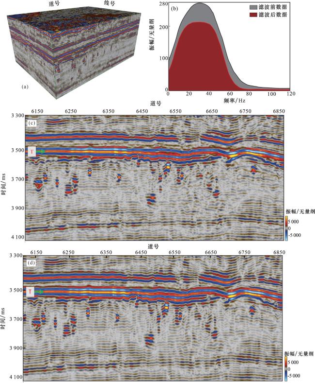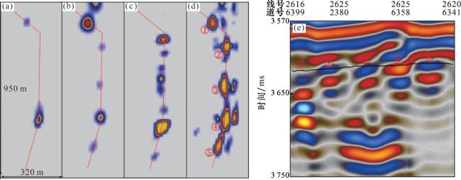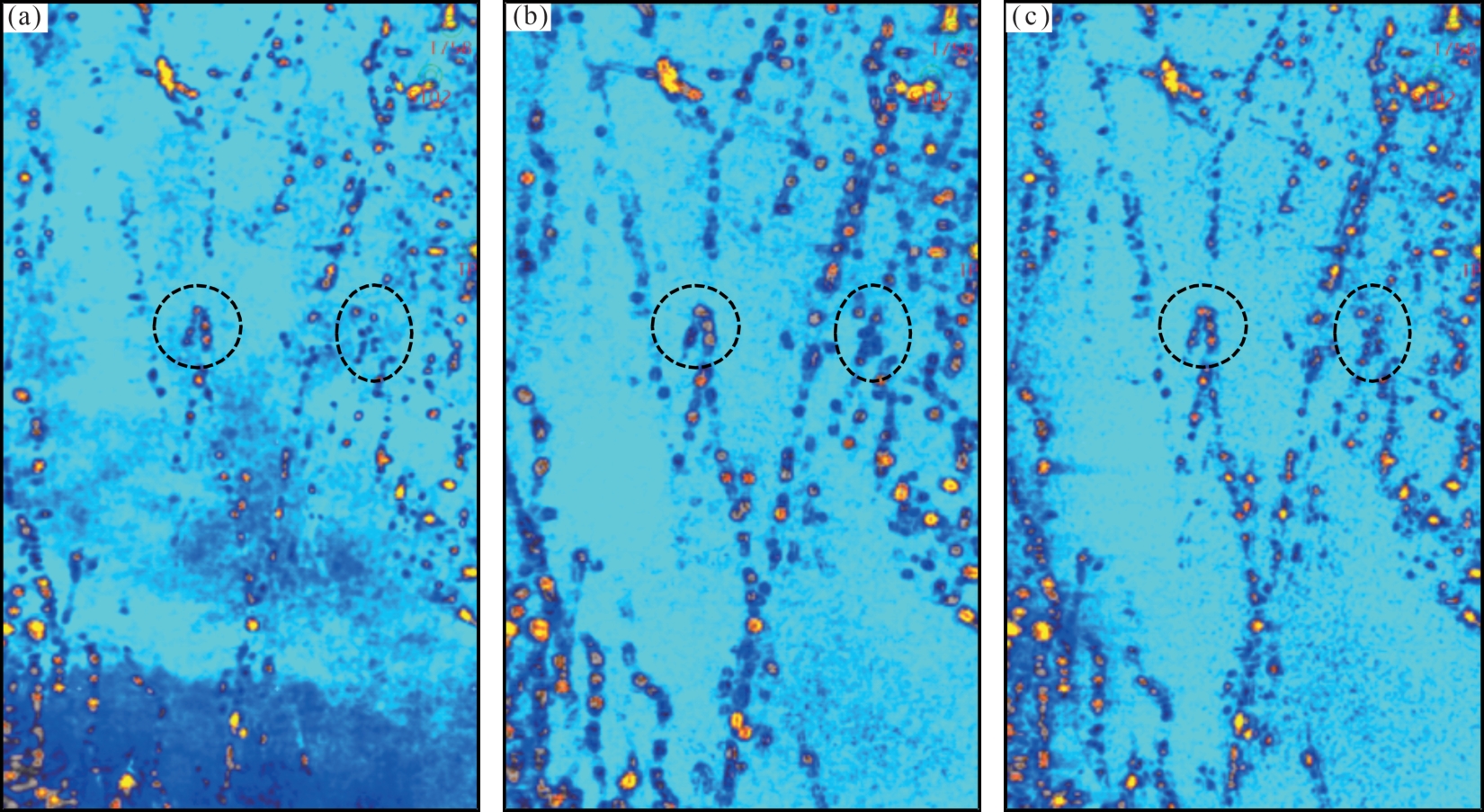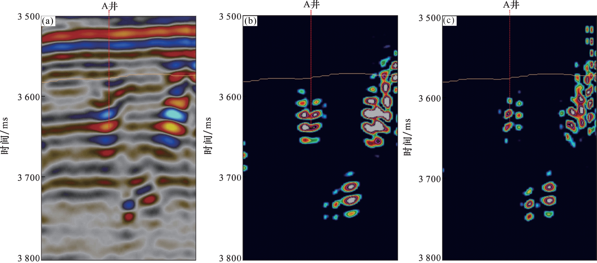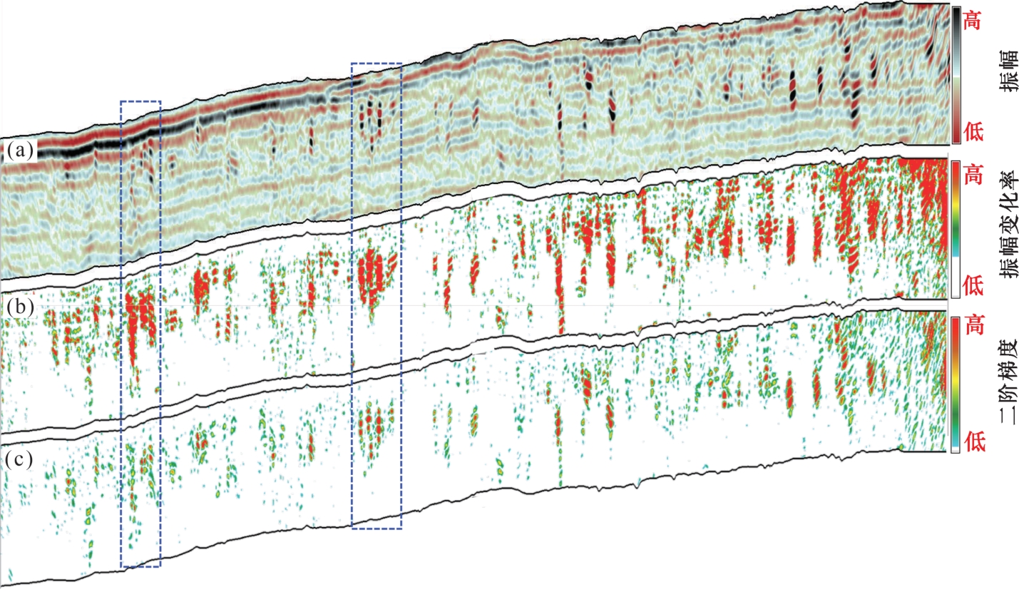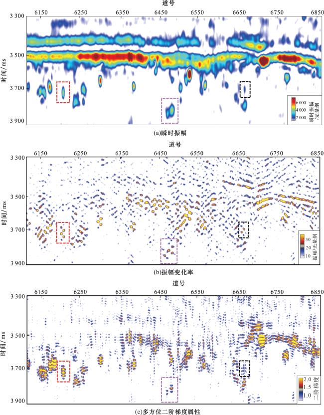 图7 不同属性溶洞识别结果剖面对比(a)原始振幅;(b)梯度模;(c)多方位二阶梯度属性 Fig.7 Profile comparison of karst cave identification results with different attributes |
