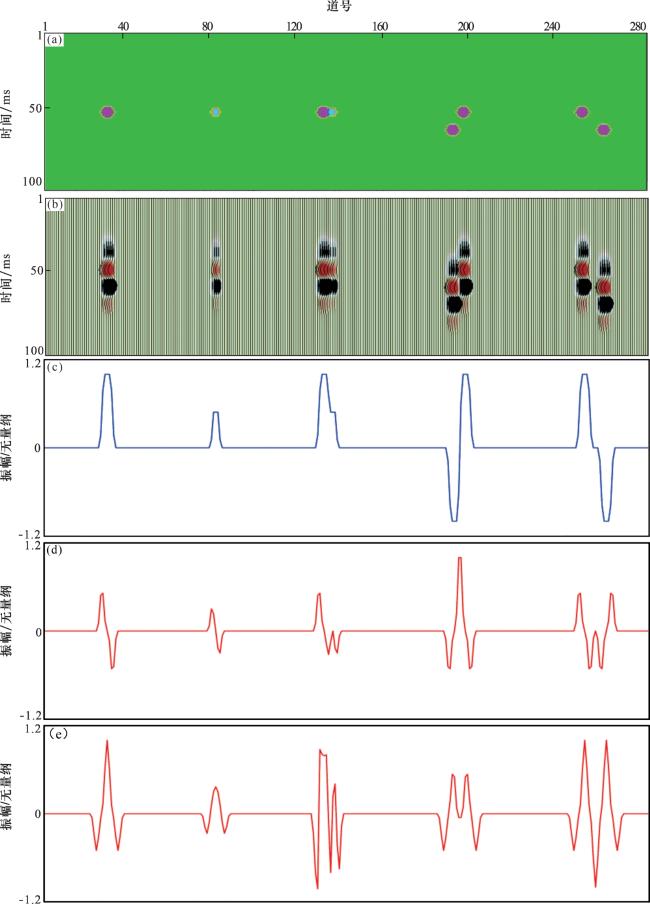 图2 振幅变化率和负二阶梯度属性结果对比(a)溶洞速度模型;(b)地震正演剖面;(c)沿层振幅曲线(t=55 ms);(d)振幅变化率;(e)负二阶导数 Fig.2 Comparison of amplitude change rate and negative second-order gradient attribute results |