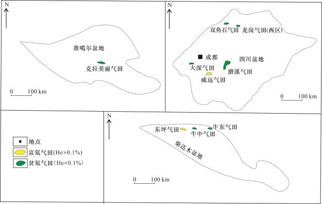 表1 中西部盆地部分气田氦气与氮气含量数据Table 1 Data of helium and nitrogen content in some gas fields in the basins in central and western China |