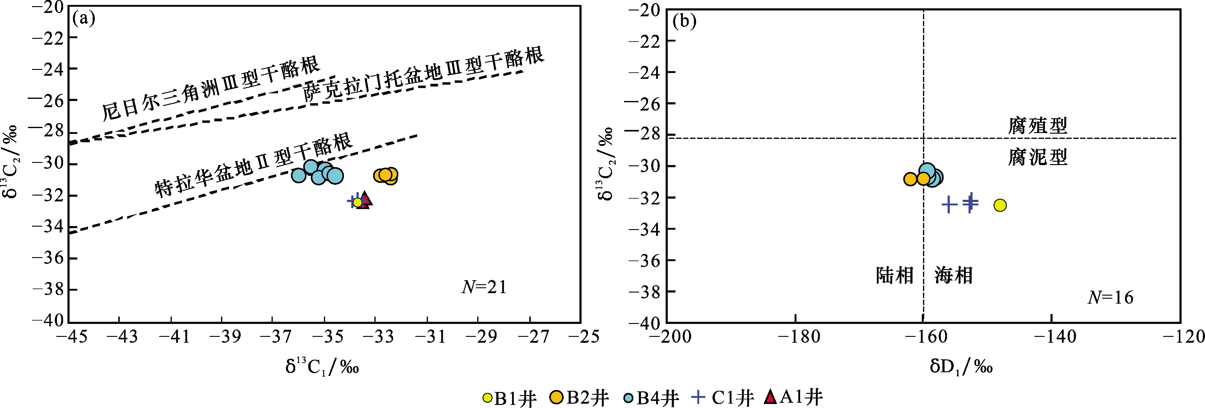 产气层 | 钻井 | 烷烃气同位素值/‰ | 计算 R O值/% | |||