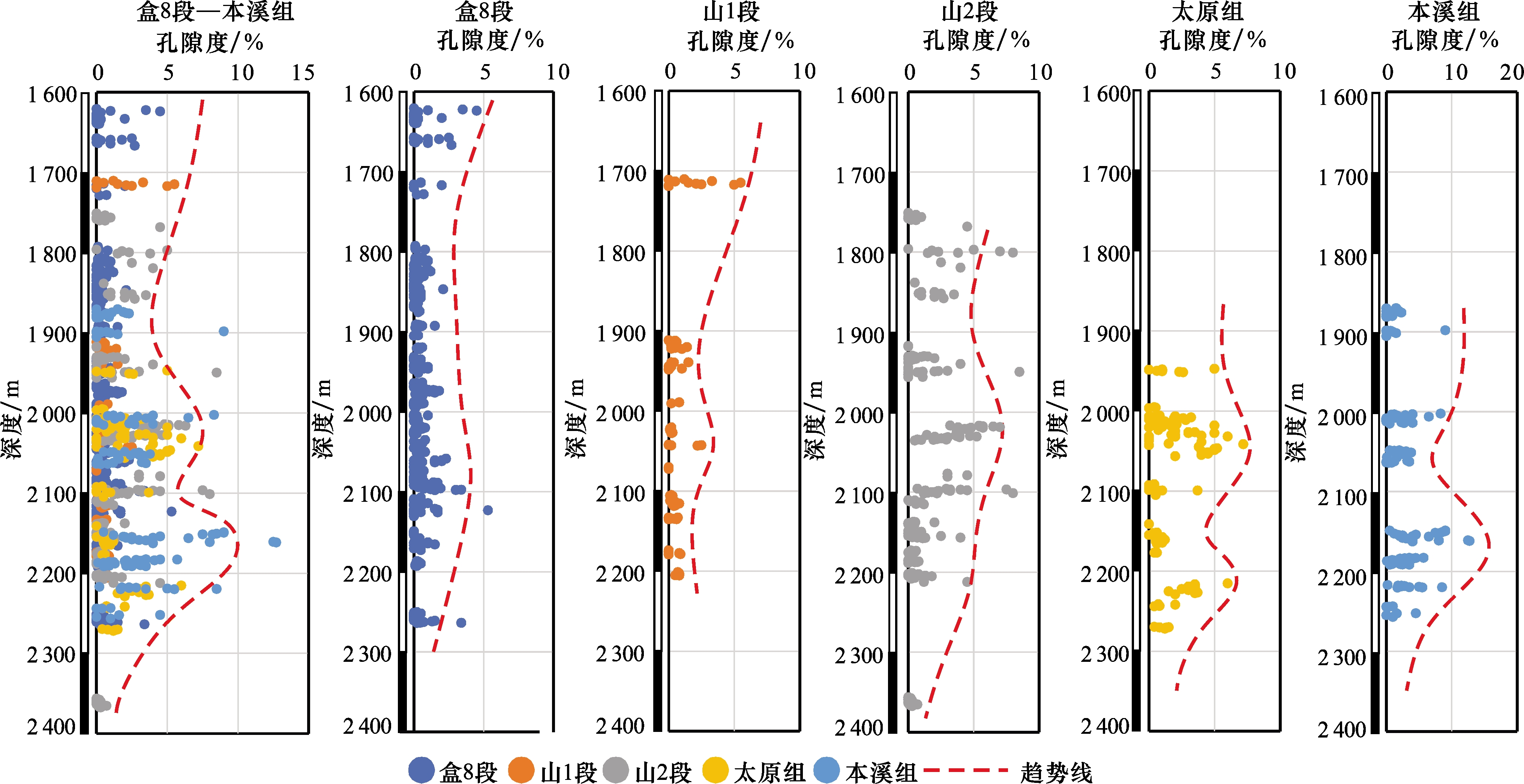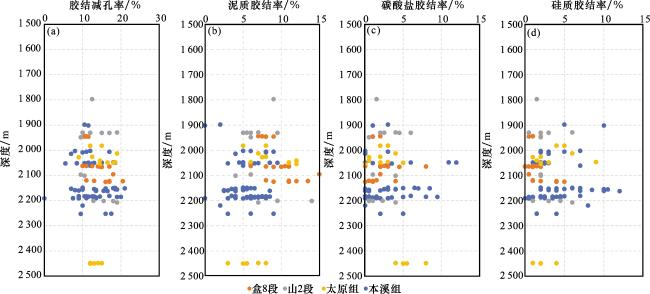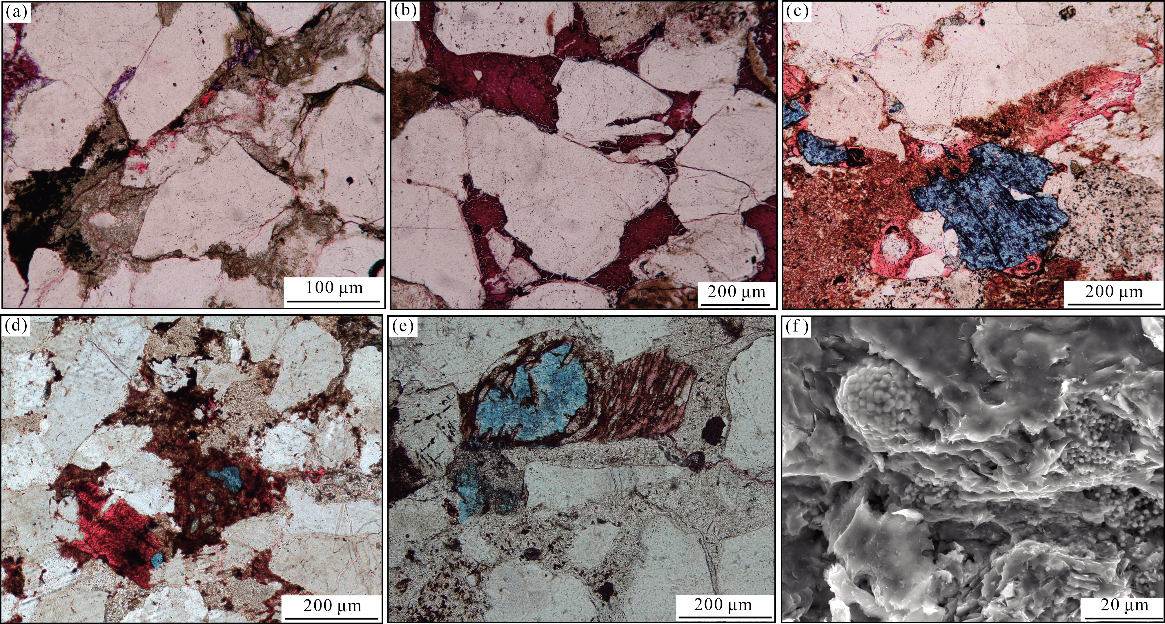 图3 佳县地区储层微观特征(a) 含铁方解石胶结,M110井,1 964 m,盒8段,(-);(b) 含铁方解石胶结,M112井,2 091 m,山1段,(-);(c) 含铁白云石填充孔隙空间,M110井,2 100 m,山2段,(-);(d) 含铁白云石填充胶结物溶孔,M157井,2 205 m,太原组,(-); (e)含铁白云石呈他型填充次生孔隙,M10井,2 403 m,本溪组,(-);(f) 准同生期形成的黄铁矿集合体经溶蚀后暴露在孔隙表面, M157井,2 203.18 m,本溪组,SEM Fig.3 Microscopic characteristics of reservoirs in the Jiaxian area |