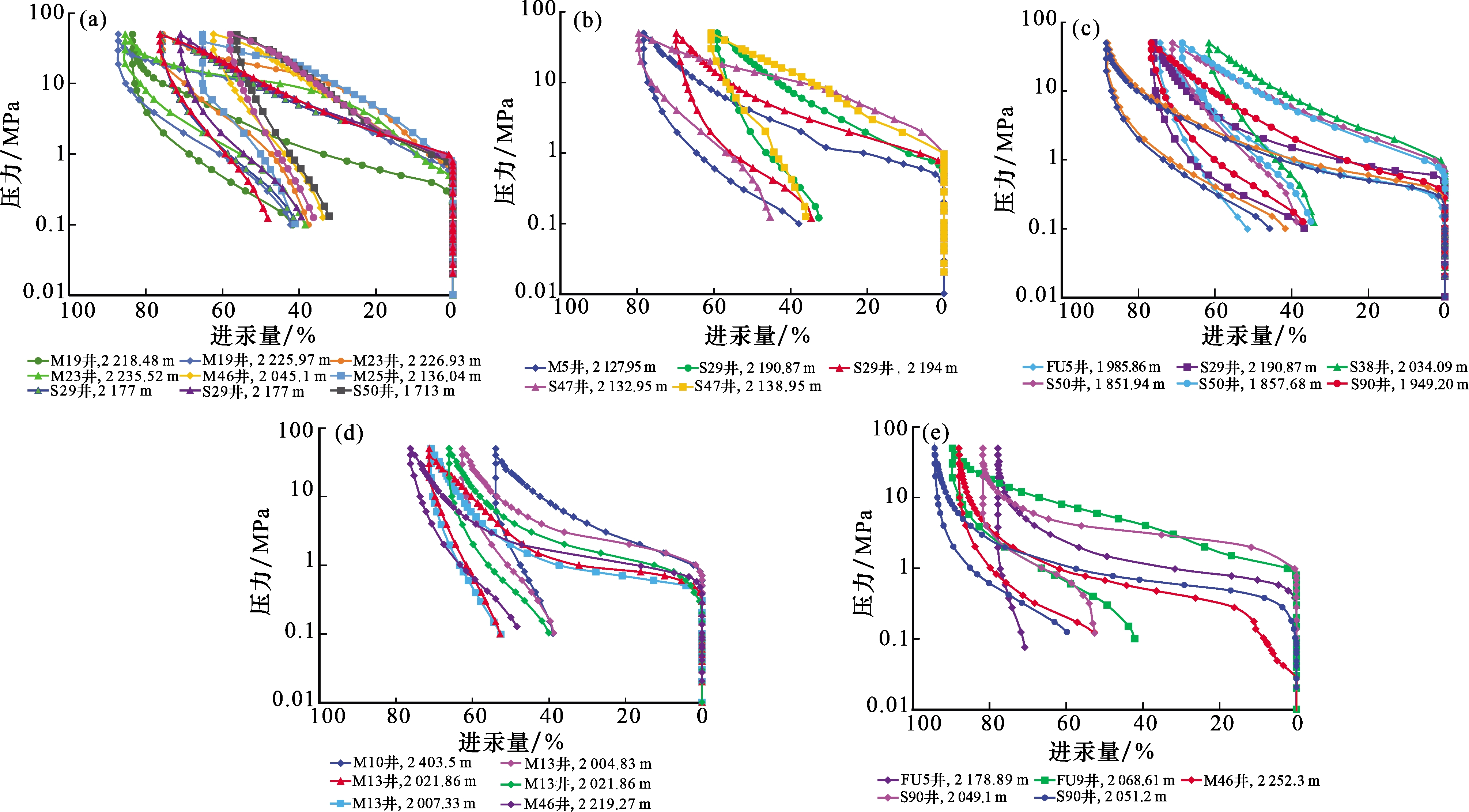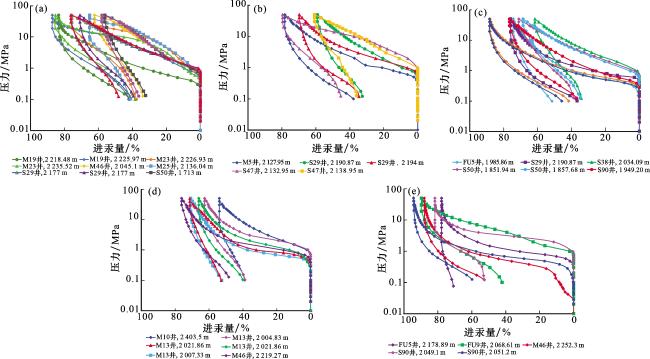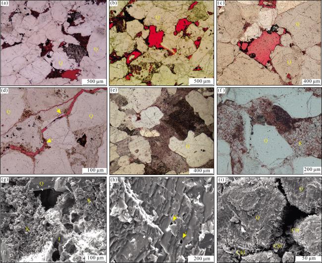 图6 下石盒子组—本溪组砂岩孔隙结构的微观特征(a) 粒间孔被后期胶结物填充,M158井,2 191 m,(-);(b) 经酸性流体溶蚀后形成的粒间溶孔和粒内溶孔,M161井,2 219 m,(-);(c) 残余粒间孔,M51井,2 060 m,(-);(d) 强烈压实作用形成的微裂缝,M110井,2 097 m,(-);(e) 孔隙空间被胶结物填充,发育晶间孔,SH90井,2 049 m,(-);(f)发育晶间孔,M28井,2 311 m,(-);(g)残余粒间孔,M109井,2 348.6 m,SEM; (h) 铁方解石溶蚀孔,M157井,2 329.45 m,SEM;(i) 残余粒间孔,M32井,2 112.5 m,SEM。注:Q为石英;I为伊利石;K为高岭石;Chl为绿泥石 Fig.6 Microscopic characteristics of sandstone pore structures in the Lower Shihezi Formation - Benxi Formation |