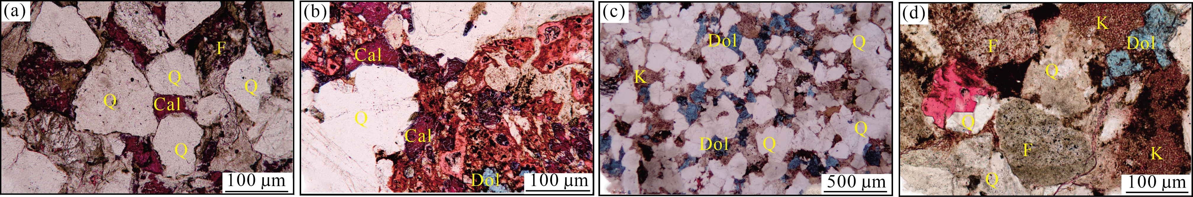 图10 佳县地区胶结作用镜下特征(a)残余粒间孔被紫红色含铁方解石填充,M110井,1 967 m,盒8段,(-);(b)泥质和碳酸盐胶结物被溶解形成大量的次生孔隙,M110井,2 101 m,山2段,(-);(c)泥质胶结溶蚀形成的次生孔隙被蓝色含铁白云石胶结物填充,M111井,2 170 m,太原组,(-);(d)岩屑溶蚀形成的铸模孔中半充填石英次生加大,M153井,2 246 m,本溪组,(-)。注:Q=石英,F=岩屑,K=高岭石,Cal=铁方解石,Dol=铁白云石 Fig.10 Microscopic characteristics of cementation in the Jiaxian area |