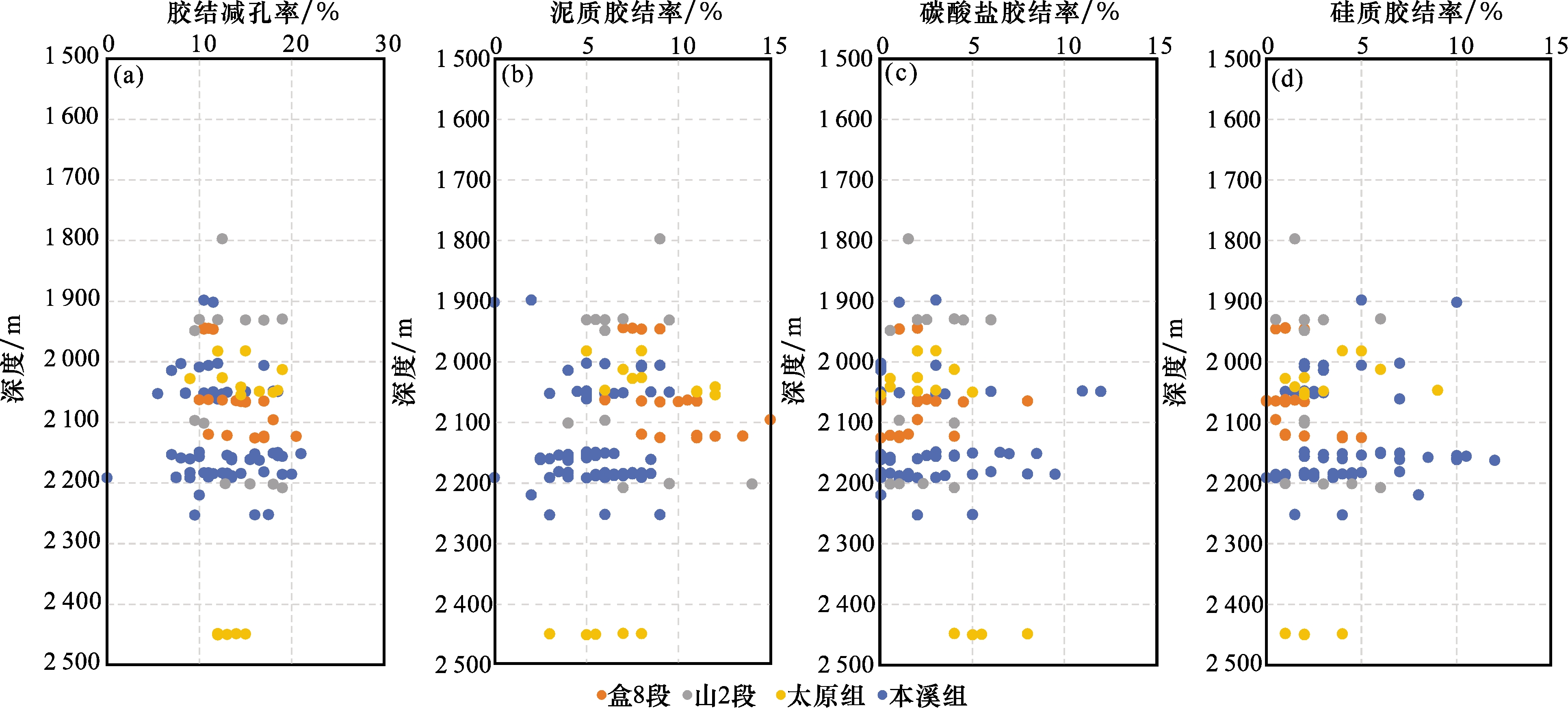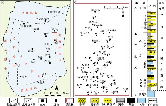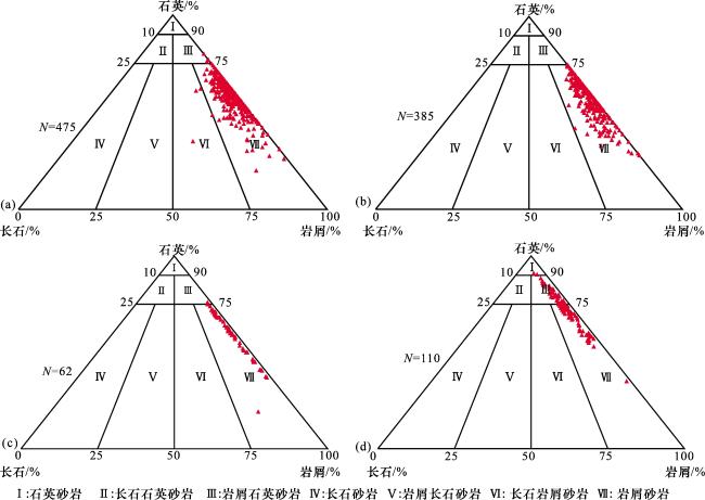 图2 佳县地区不同层位岩性三角图(a)盒8段;(b)山1段+山2段;(c)太原组;(d)本溪组 Fig.2 Triangular diagram of lithology at different stratigraphic levels in Jiaxian area |