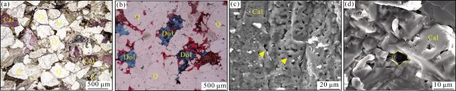 图11 研究区多期溶蚀作用镜下特征(a) 后期铁方解石填充,未被溶蚀,M65井,1 931 m,(-);(b) 泥质胶结物溶孔被后期铁白云石填充,M128井,2 006 m,(-);(c) 晚期含铁方解石溶孔,SH33井,2 422.5 m,SEM;(d) 晚期含铁方解石溶孔,M153井,2 377 m,SEM。注:Q=石英,F=岩屑,K=高岭石,Cal=铁方解石,Dol=铁白云石 Fig.11 Microscopic characteristics diagram of multiple-stage dissolution in the study area |