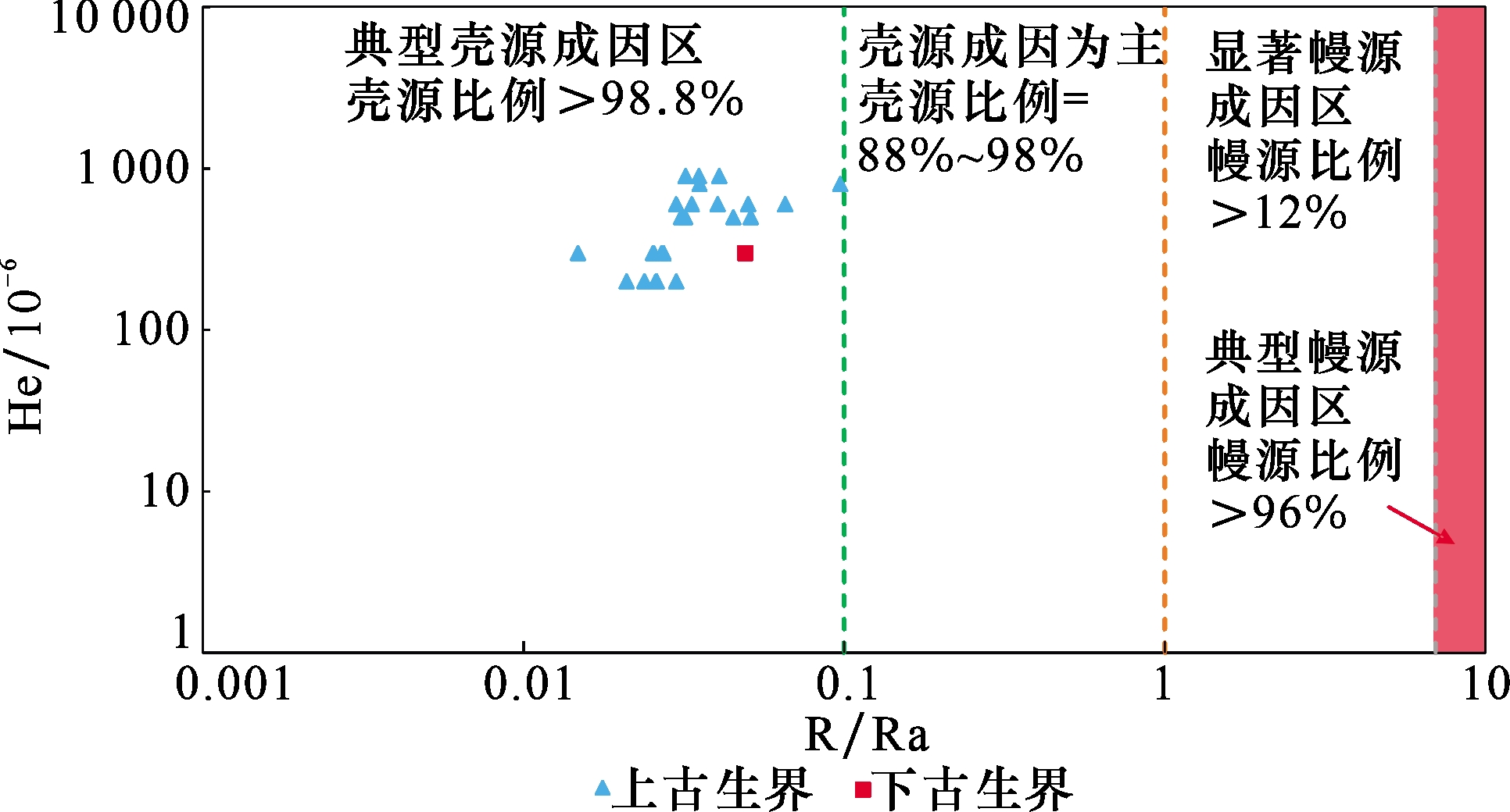 图12 苏里格气田天然气稀有气体R/Ra与He含量判别Fig.12 Content identification diagram of R/Ra and helium content of natural gas rare gases in Sulige Gas Field |