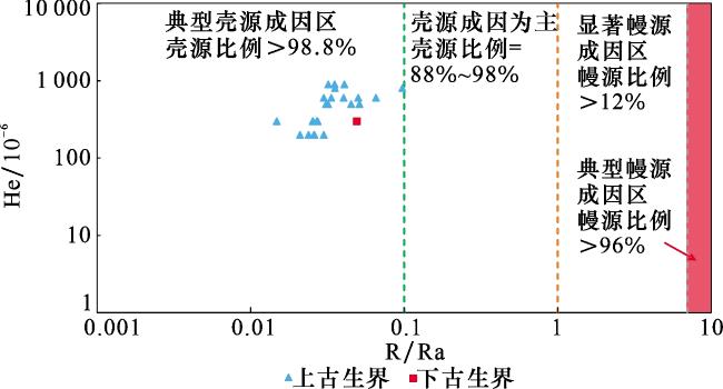 表3 苏里格气田古生界天然气氦同位素及来源数据Table 3 Helium isotope and source data of Paleozoic natural gas in Sulige Gas Field |