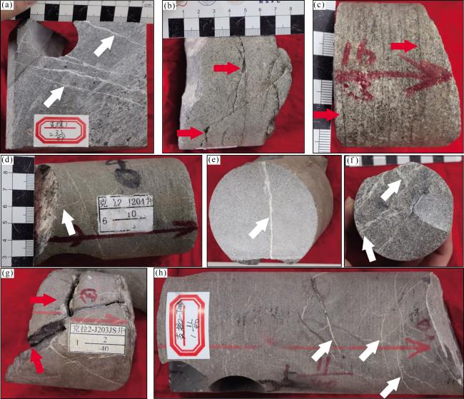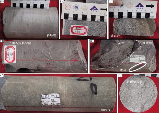 图2 亚格列木组岩心照片(a)克探1井,2-37/83块,褐灰色粗砂岩,斜层理; (b)克探1井,2-33/83块,含砾砂岩; (c)克探1,2-22/83块,褐灰色砂砾岩;(d) KL2-J203JS井,1-11/40块,细砂岩,低角度充填网状缝;(e)KL2-J203JS井,1-8/40块,细砂岩/泥岩岩性转换面,冲刷面;(f)KL2-J204井,6-43/70块,细砂岩;(g) KL2-J204井,6-46/70块,含砾细砂岩。注:2-37/83代表筒次—块数编号/总块数 Fig.2 Photo of the cores of the Yageliemu Formation |