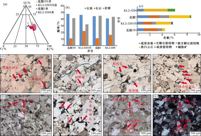 图5 亚格列木组岩石学特征与储集空间类型(a)克探1气藏砂岩类型三角图;(b)克探1气藏储层颗粒成分含量柱状图;(c)克探1气藏填隙物成分含量柱状图;(d)克探1井,5 179 m,10×,(-),底部砂岩段,部分残余粒间孔,偶见粒内溶孔;(e)KL2-J204井,5 590.62 m,10×,(-),底部砂岩段,微裂缝贯穿,少量粒间孔;(f)KL2-J204井,5 590.14 m,10×,(-),中粗粒长石岩屑砂岩,微裂缝连通粒间孔隙;(g)KL2-J204井,5 591.68 m,10×,(-),底部砂岩段,原生粒间孔,少量粒内溶孔;(h)克探1井,5 164.08 m,10×,(-),中砂岩,泥质杂基含量高,见碳酸盐胶结物;(i) KL2-J204井,5 592.12m,10×,(-),粗中粒岩屑砂岩,原生粒间孔;(j)克探1井,5 160.36 m,10×,(-),粗砂岩,泥质杂基高,含量高,见碳酸盐胶结物;(k)克探1井,5 160.36 m,10×,(+),粗砂岩,泥质杂基高,含量高,见碳酸盐胶结物 Fig.5 Petrographic characteristics and reservoir space types of the Yageliemu Formation |