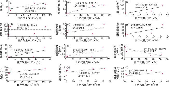 | 井号 | 大裂缝/断层 | 砂体 | 微裂缝 | 物性 | 应力 | 产能 /(104 m3/d) | ||||