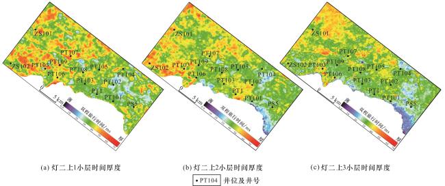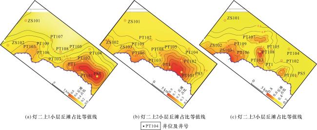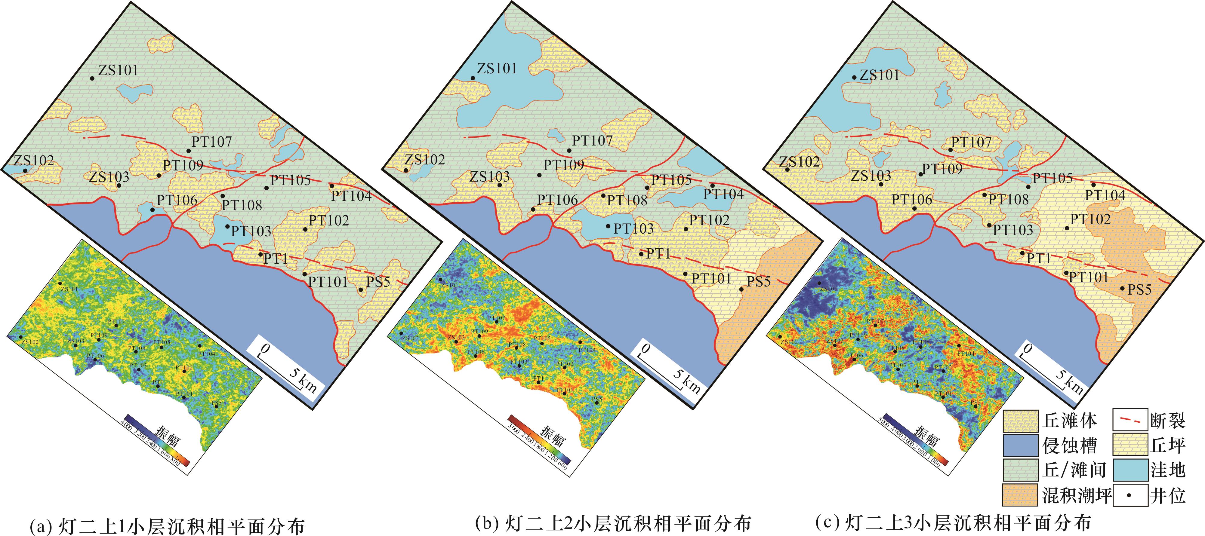 图7 蓬莱气区灯二上亚段沉积相平面分布(注:各小层沉积相平面分布图下方为对应小层均方根振幅属性图) Fig.7 Planar distribution of sedimentary facies of the upper layer of Deng 2 Member in Penglai Gas Field |
