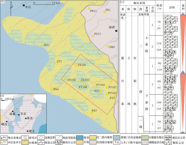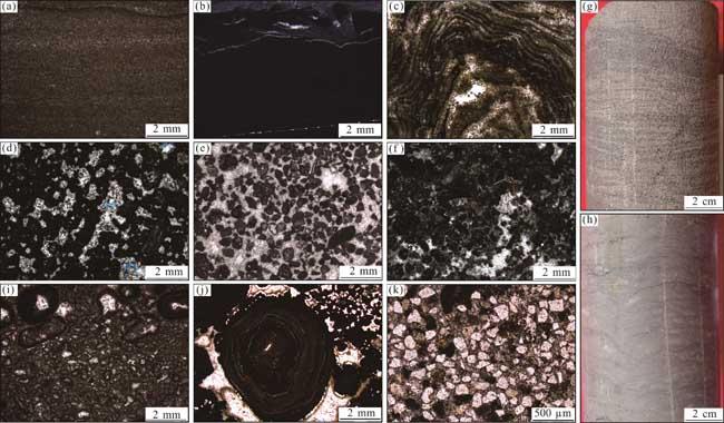 图4 蓬莱气区灯二上亚段岩石主要类型及特征(a)泥—粉晶云岩,发育水平层理,普通薄片(-),PS5井,灯二段,5 644.35 m;(b)泥晶云岩,受风暴浪基面搅动,岩石破碎形成角砾,砾间充填粗粒物质,普通薄片(-),PS4井,灯二段,6 308.41 m;(c)叠层石云岩,纹层呈穹窿状,普通薄片(-),ZS102井,灯二段,6 069.52 m;(d)凝块云岩,搁架孔发育,内部充填白云石胶结物,铸体薄片(-),PT103井,灯二段,6 102.47 m;(e)砂屑云岩,砂屑磨圆较好,粒间充填亮晶白云石,普通薄片(-),PT101井,灯二段,5 714.21 m;(f)黏结砂屑云岩,可见明显的黏结结构,普通薄片(-),PS5井,灯二段,5 665.48 m;(g)云质砂岩,见平行层理构造,岩心,PS5井,灯二段,5 658.07~5 658.20 m;(h)藻纹层云岩,岩石致密,发育纹层结构,岩心,PS4井,灯二段,6 309.76~6 309.92 m;(i)鲕粒云岩,鲕粒内部发育溶蚀孔洞,并被白云石胶结物完全充填,普通薄片(-),PS4井,灯二段,6 384.77 m;(j)核形石云岩,普通薄片(-),PS4井,灯二段,6 238.85 m;(k)云质砂岩,碎屑颗粒成分主要为石英颗粒,具一定磨圆特征,普通薄片(-),PS5井,灯二段,5 656.75 m Fig.4 Main types of rocks and characteristics of the upper layer of Deng 2 Member in Penglai Gas Field |