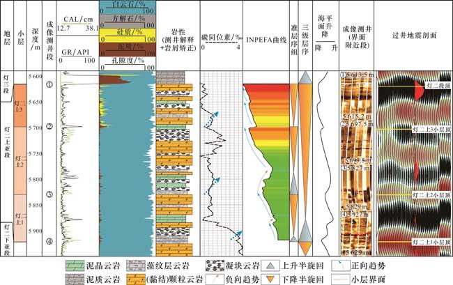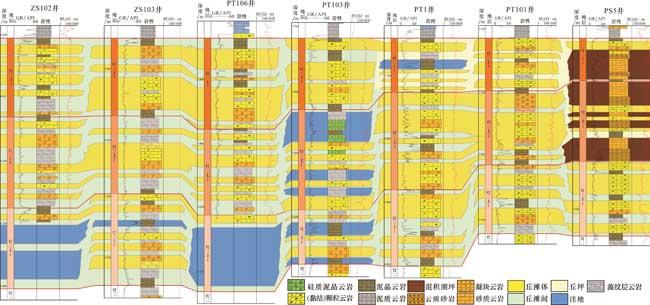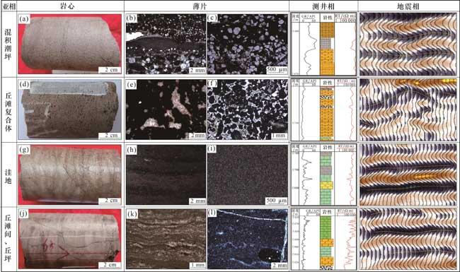 图5 蓬莱气区灯二上亚段沉积相识别模版(a)砂质云岩,岩心,PS5井,灯二段,5 662.16~5 662.25 m;(b)砂质云岩,普通薄片(-),PS5井,灯二段,5 662.83 m;(c)云质砂岩,普通薄片(-),PS5井,灯二段,5 658.57 m;(d)颗粒云岩,岩心,PT1井,灯二段,5 731.08~5 731.18 m;(e)凝块云岩,普通薄片(-),PS4井,灯二段,6 236.85 m;(f)砂屑云岩,铸体薄片(-),PT101井,灯二段,5 725.5 m;(g)泥晶云岩,岩心,ZS101井,灯二段,6 511.96~6 512.24 m;(h)泥晶云岩,普通薄片(-),PS4井,灯二段,6 210.53 m;(i)粉晶云岩,普通薄片(-),PS4井,灯二段,6 311.32 m;(j)泥晶云岩,岩心,PS4井,灯二段,5 642.63~5 642.75 m;(k)藻纹层云岩,普通薄片(-),PS4井,灯二段,6 310.64 m;(l)球粒云岩,普通薄片(-),PT103井,灯二段,5 747.62 m Fig.5 Sedimentary facies identification template of the upper layer of Deng 2 Member in Penglai Gas Field |