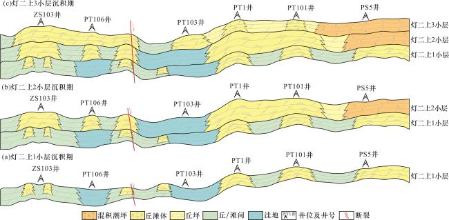 表1 蓬莱气区灯二上亚段沉积相类型及特征Table 1 Types and characteristics of sedimentary facies in the upper layer of the Deng 2 Member in the Penglai Gas Field |