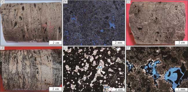 图10 蓬莱气区灯二上亚段储层特征(a)颗粒白云岩,发育小型孤立状溶洞,岩心,PT1井,灯二段,5 728.72~5 728.85 m;(b)黏结颗粒云岩,可见大量粒内溶孔和粒间孔,铸体薄片(-),PT105井,灯二段,5 836 m;(c)凝块云岩,发育小型孤立状溶洞,岩心,PT101井,灯二段,5 752.34~5 752.43 m;(d)叠层云岩,发育小型溶洞,岩心,ZS102井,灯二段,6 059.00~6 059.18 m;(e)凝块云岩,发育大量格架孔,内部被白云石胶结物全充填—半充填,铸体薄片(-),PT103井,灯二段,6 102.47 m;(f)凝块云岩,发育扩溶格架孔,内部被沥青半充填,铸体薄片(-),ZS101井,灯二段,6 233.54 m Fig.10 Reservoir characteristics of the upper layer of Deng 2 Member in Penglai Gas Field |