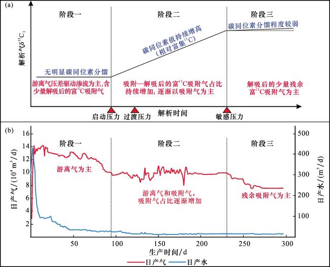 图4 鄂尔多斯盆地煤岩气解析过程中甲烷碳同位素分馏模式(a)与煤岩气典型水平井生产曲线对应关系(b)(煤岩气典型水平井生产曲线图据文献[2]修改,启动压力、过渡压力和敏感压力来源于文献[34])Fig.4 Relationship between the methane carbon isotope fractionation model and the production curve of typical horizontal well of coal rock gas in the Ordos Basin (the production curve of typical horizontal well of coal rock gas modified after Ref.[2],and starting pressure, transition pressure and sensitive pressure are from Ref.[34] ) |