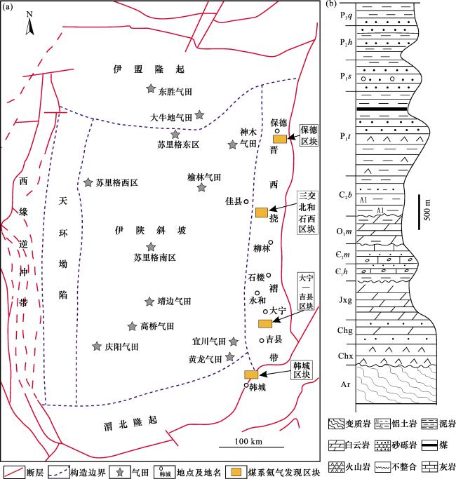 图1 鄂尔多斯盆地构造分区(a)(据文献[12])及潜在氦源岩地层柱状图(b)(据文献[18]) Fig.1 Tectonic framework of the Ordos Basin (after Ref.[12])(a) and stratigraphic column of potential helium source rocks in the Ordos Basin (after Ref.[18])(b) |