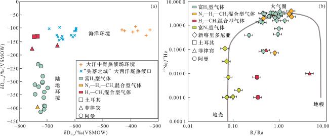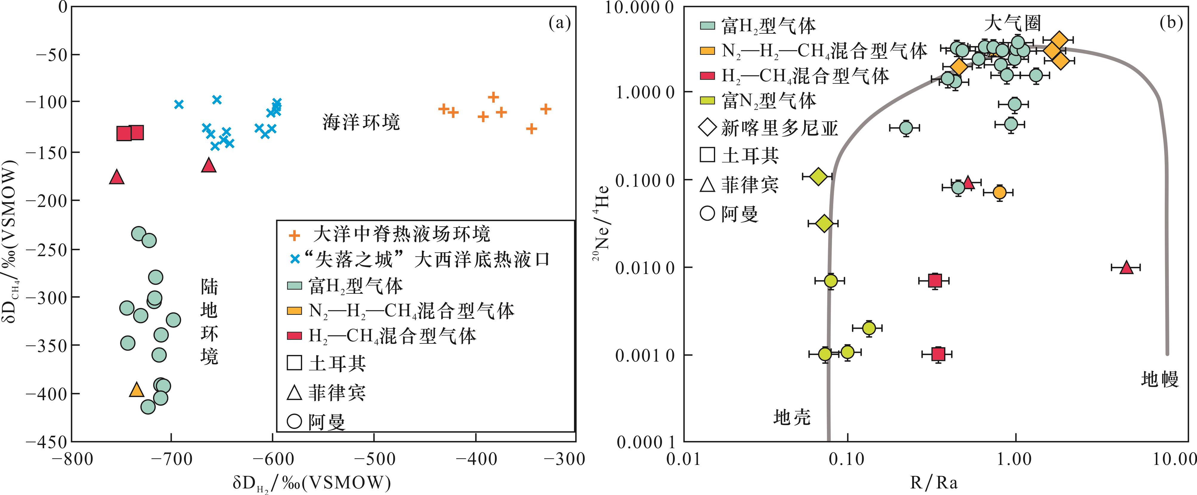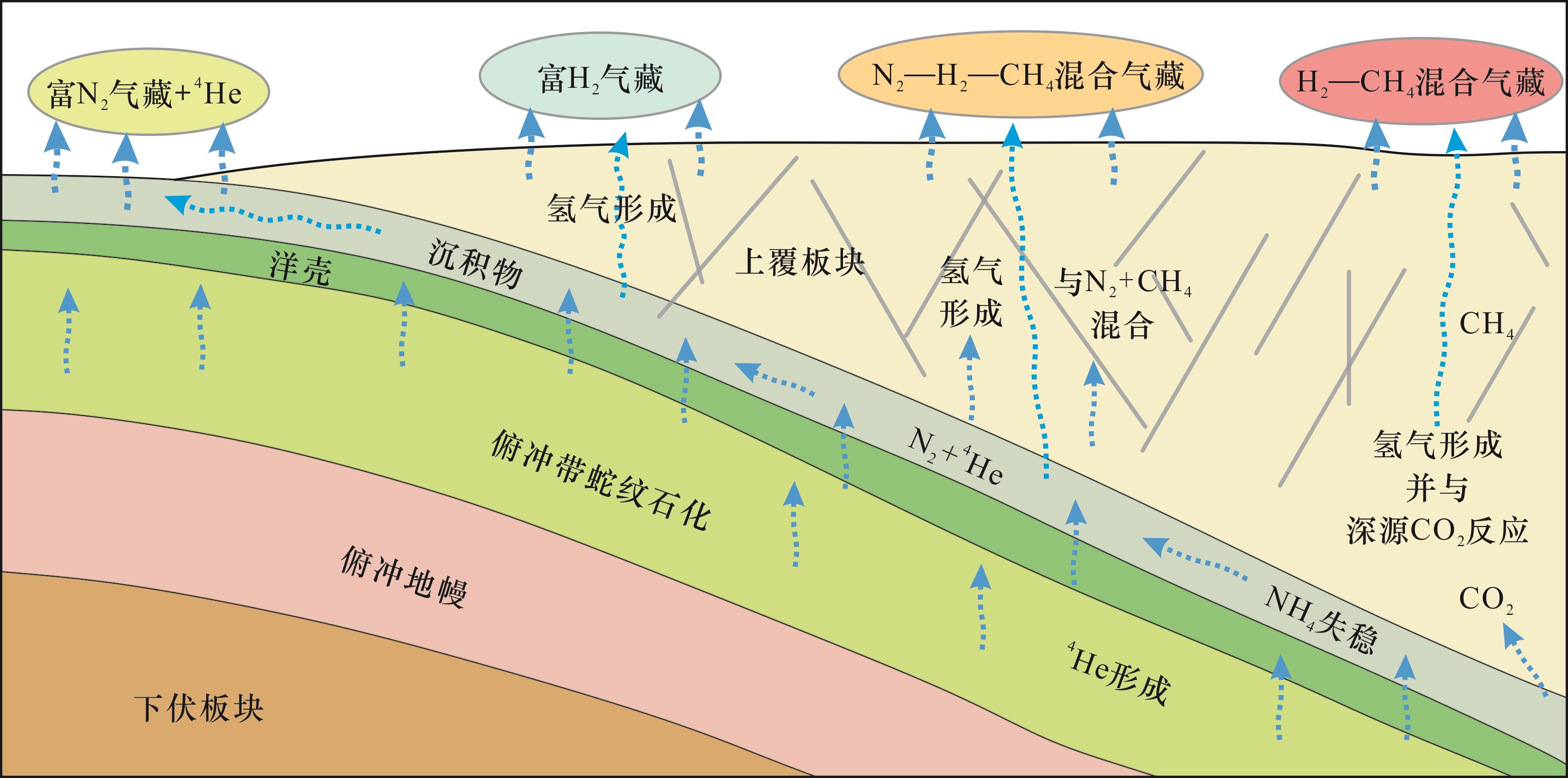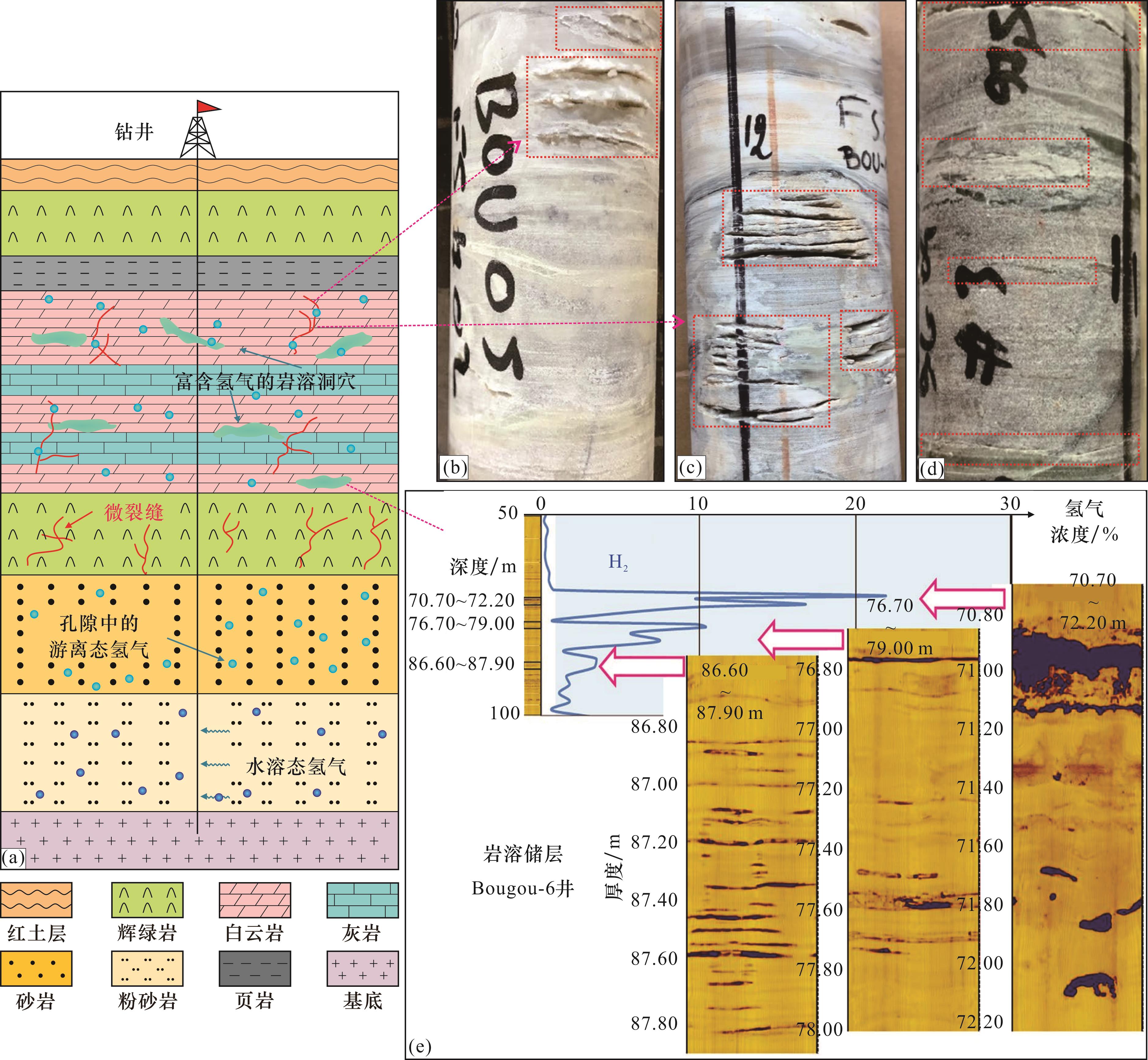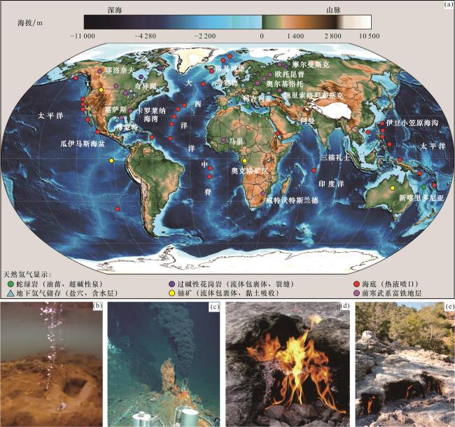 图8(e)],且在碳酸盐岩储层下部存在一套微裂缝较发育的辉绿岩夹层,为天然氢气的运移提供了通道。Bourakebougou井区的砂岩和碳酸盐岩储层中较高的氢气含量表明,沉积盆地中传统的油气藏储层同样具备天然氢气的储集条件。近期在阿曼哈贾尔山脉的沉积岩、岩浆岩和变质岩三大类岩层中均发现有高含量的氢气显示
