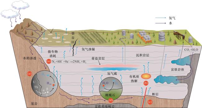 [97],远高于黏土层吸附甲烷的能力。铀矿床中黏土层吸附氢气的发现延伸了以往对氢气赋存机理的认识,即沉积岩和基底岩中的水饱和黏土矿物表面发育的大量微—纳米级孔隙网络,可显著增强黏土层吸附氢气的能力。此外,伊利石、蒙脱石和绿泥石等黏土矿物在特定环境下能够释放Fe