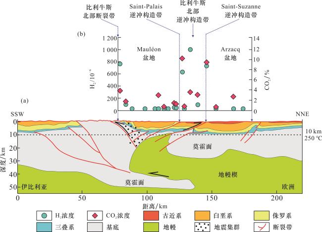 图8)。其南部Bourakebougou井区的最主要的天然氢气产层为断块基底之上的砂岩和碳酸盐岩储层[