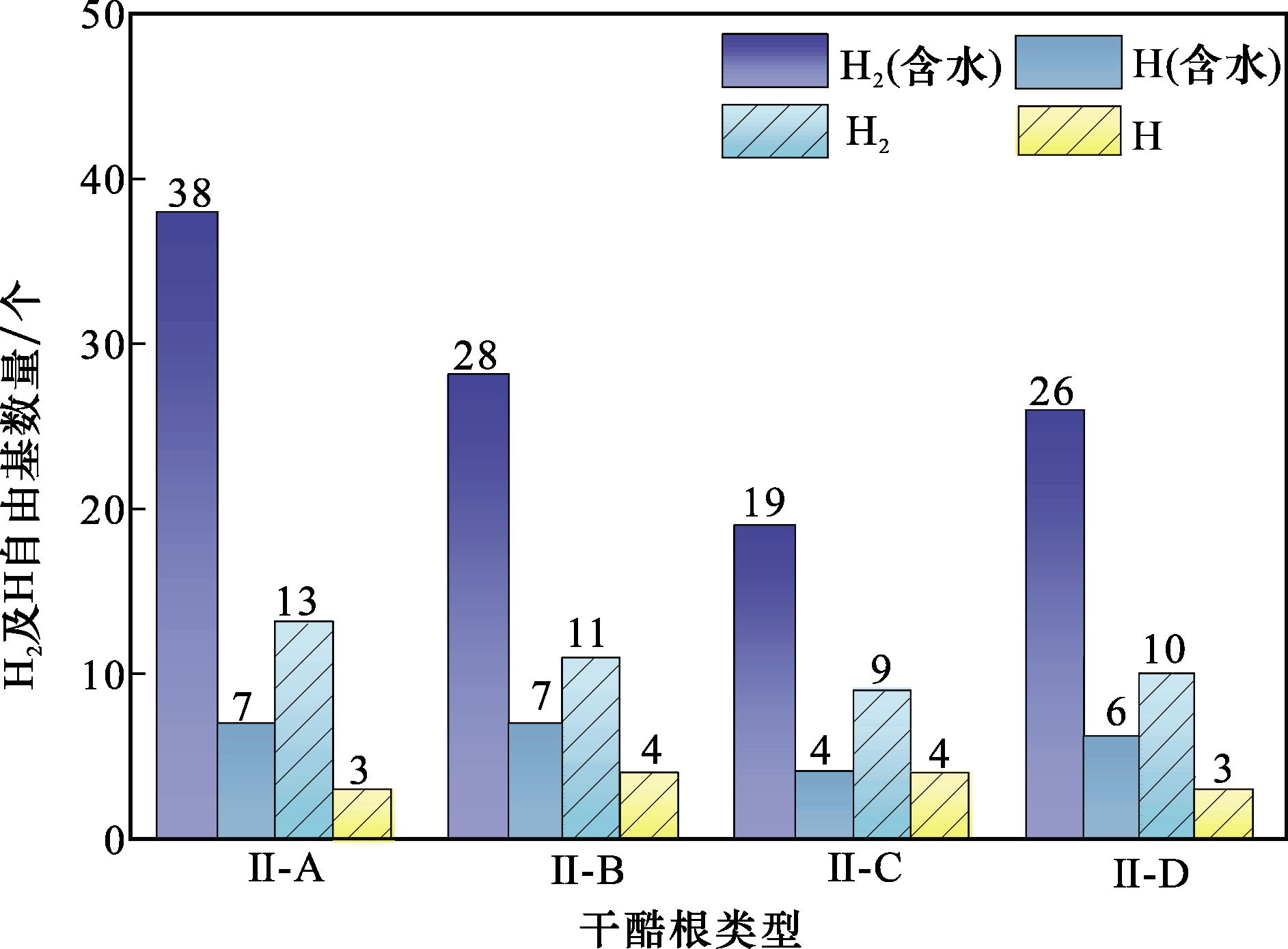 烃源岩干酪根在热成熟演化过程中具有巨大的生氢潜力。目前干酪根热演化过程产氢特征不清,干酪根化学结构与孔隙结构对产氢能力的影响机制不明,水分对干酪根热解产氢的作用机理有待阐明。采用基于ReaxFF力场的反应分子动力学模拟方法,构建干燥和含水条件下干酪根单元结构与基质模型,开展未成熟干酪根升温热演化热解模拟,对比不同成熟度阶段干酪根热解生氢特征。结果表明:①热成熟演化过程中,低成熟干酪根热解产氢能力更强,氢气主要在其高温热解阶段产生;②脂肪族结构上氢原子脱落组合形成氢气是干酪根热演化产氢的主要模式;③水分通过氢源作用以及催化作用促进干酪根脂肪族结构热解产氢;④干酪根热演化产氢受化学结构和孔隙结构共同作用,化学结构影响大于孔隙结构影响。研究结果完善了干酪根热解产氢理论,可为天然氢藏勘探开发提供理论指导。