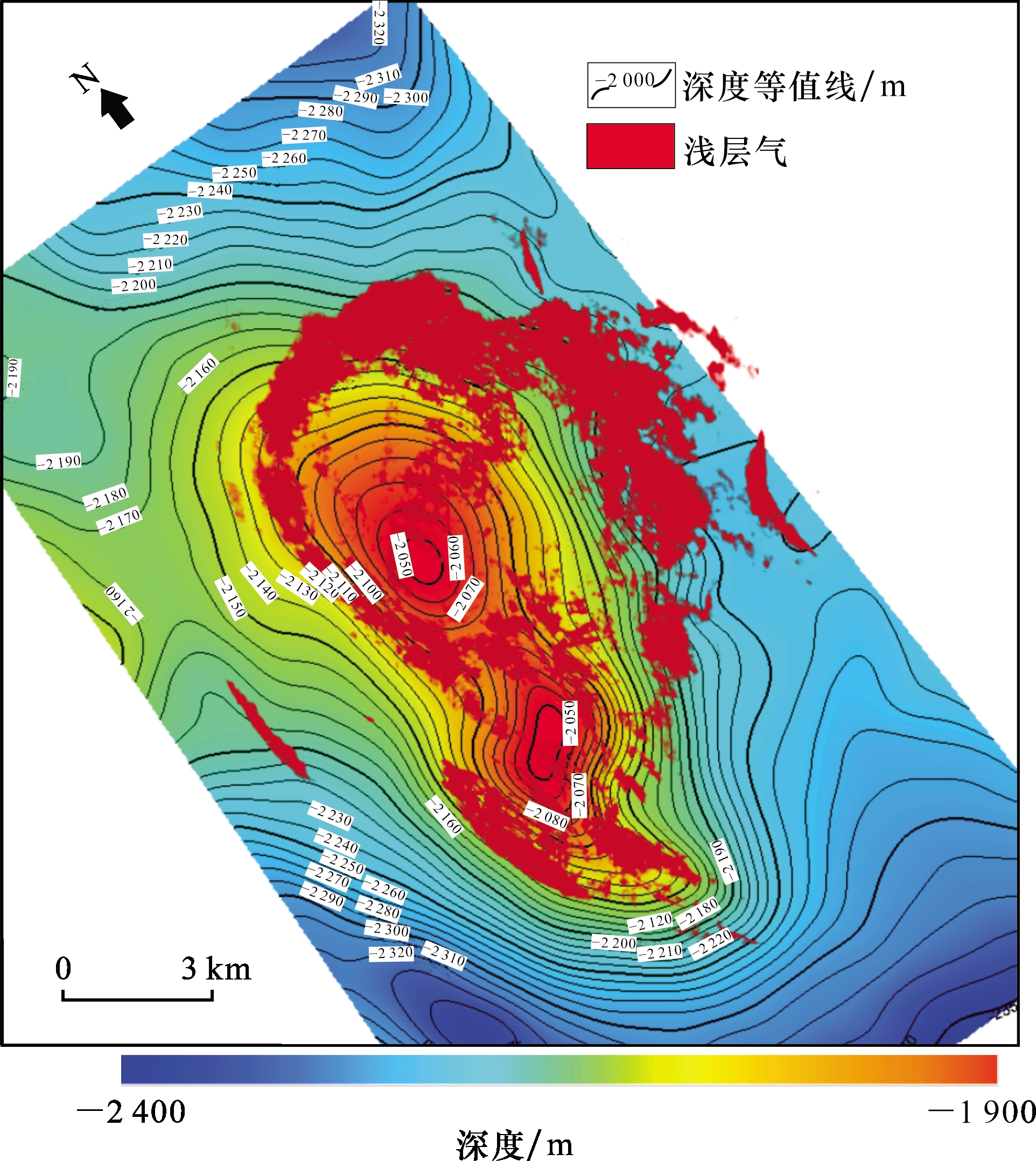 图4 乐东2X底辟T25深度构造叠加浅层气立体显示Fig.4 Ledong 2X diapir belt T25 depth structure overlay shallow gas stereoscopic display |