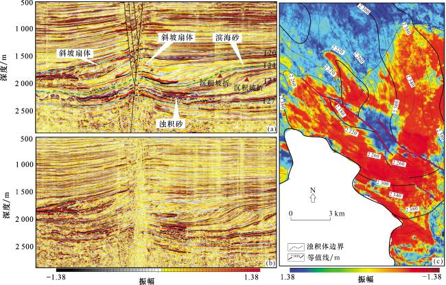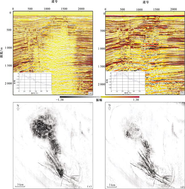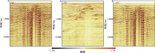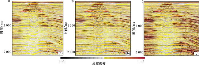 图7 两步法补偿与常规补偿地震剖面对比(a) 补偿前地震剖面;(b) 两步法补偿后地震剖面; (c) 常规Q补偿后地震剖面 Fig.7 Comparison of two-step compensation and conventional compensation seismic profiles |