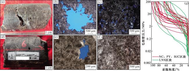 图6 不同区块储层特征对比(a)白云岩,沿裂缝溶蚀,孔洞发育,5 217.95~5 218.05 m,PY106井,NC区块;(b)白云岩,裂缝沟通溶蚀孔洞,6 058.61 m,PY3井,BJC区块,铸体薄片,单偏光;(c)白云岩,基质孔发育,5 217.30 m,PY106井,NC区块,铸体薄片,单偏光;(d)白云岩,可见较孤立的溶洞发育,4 489.82~4 489.92 m,MX039-H1井,LNS区块;(e)白云岩,发育溶洞,4 480.16 m,PY6井,LNS区块,铸体薄片,单偏光;(f)白云岩,基质孔不发育,4 481.24 m,MX039-H1井,LNS区块,铸体薄片,单偏光;(g)不同区块典型毛细管压力曲线 Fig.6 Comparison of reservoir characteristics in different blocks |