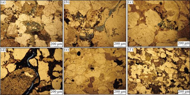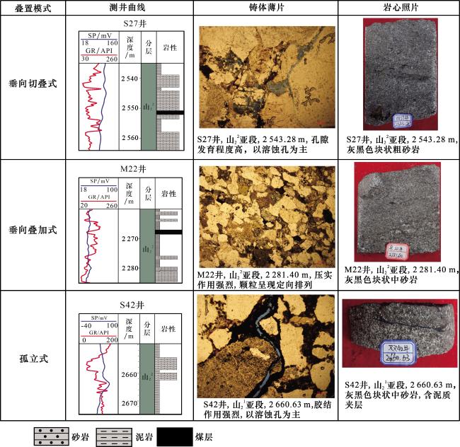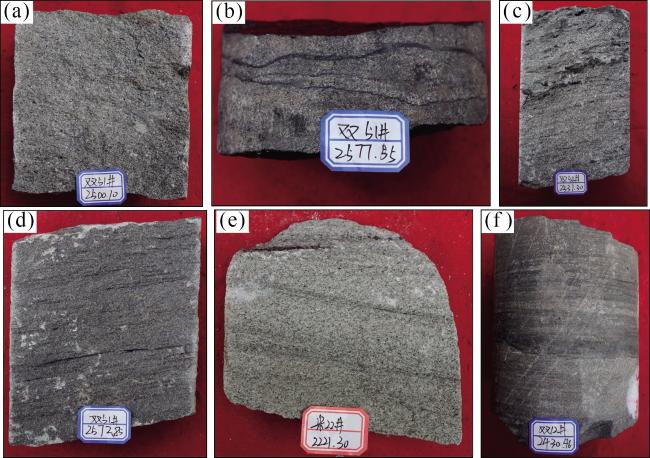 图2 S51井区山2段典型岩相特征(a) S51井2 500.10 m 深灰色块状层理粗砂岩相;(b) S51井 2 577.55 m 灰黑色块状层理中砂岩相;(c) S51井 2 531.30 m深灰色平行层理粗砂岩相;(d) S51井2 572.85 m深灰色平行层理中砂岩相;(e) M22井2 221.30 m灰绿色交错层理中砂岩相;(f)S12井2 430.46 m灰褐色水平层理泥岩相 Fig.2 Typical lithofacies characteristics of the second member of Shan Formation in S51 well block |