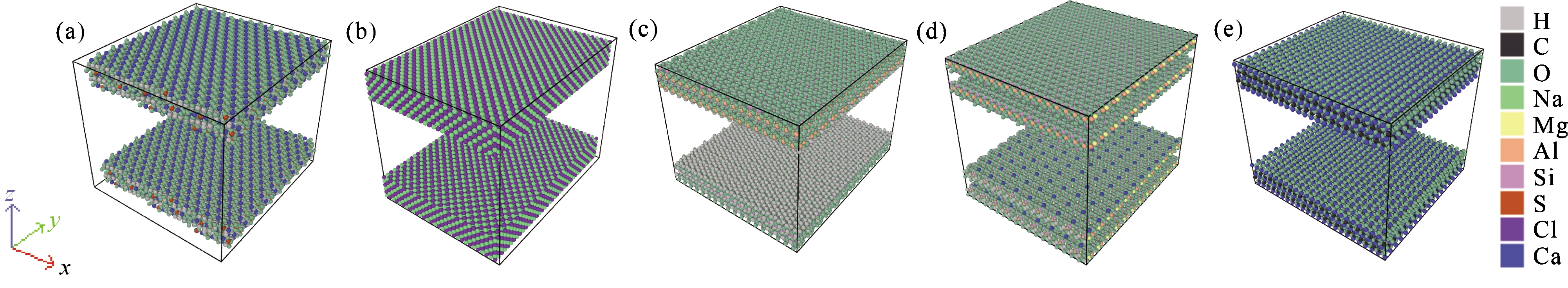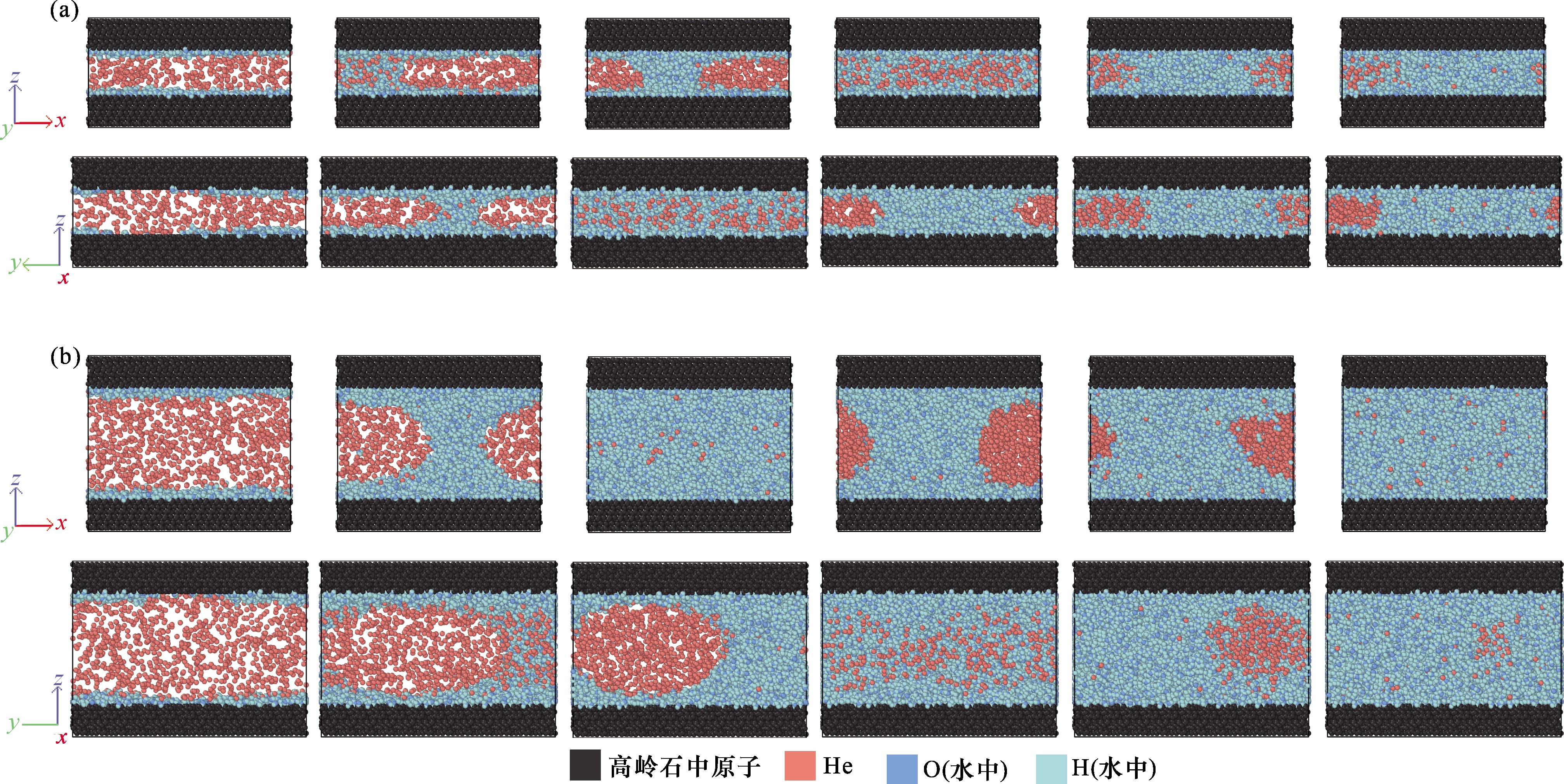 图11 高岭石孔隙中含有不同比例的水时,氦气与水的赋存状态[从左到右,孔隙含水量分别为10%、30%、50%、70%、90%、100%。孔隙直径为 2 nm (a) 和5 nm (b)]Fig.11 The occurrence states of helium and water in kaolinite pores with varying water contents [from left to right, the pore water content is 10%,30%,50%,70%,90%,and 100%,respectively. The pore apertures are 2 nm(a) and 5 nm(b)] |