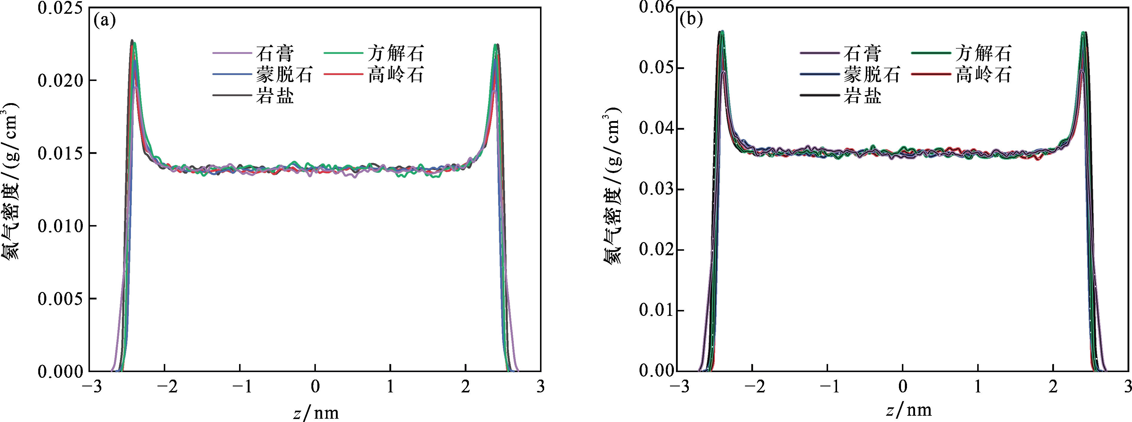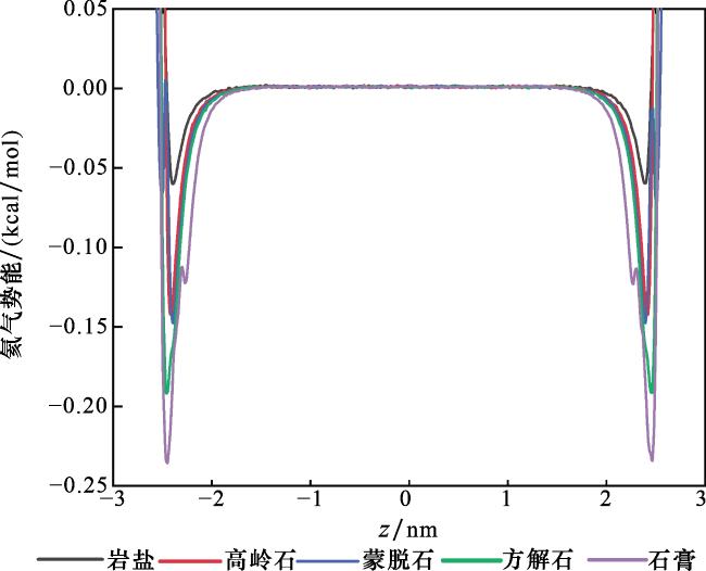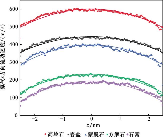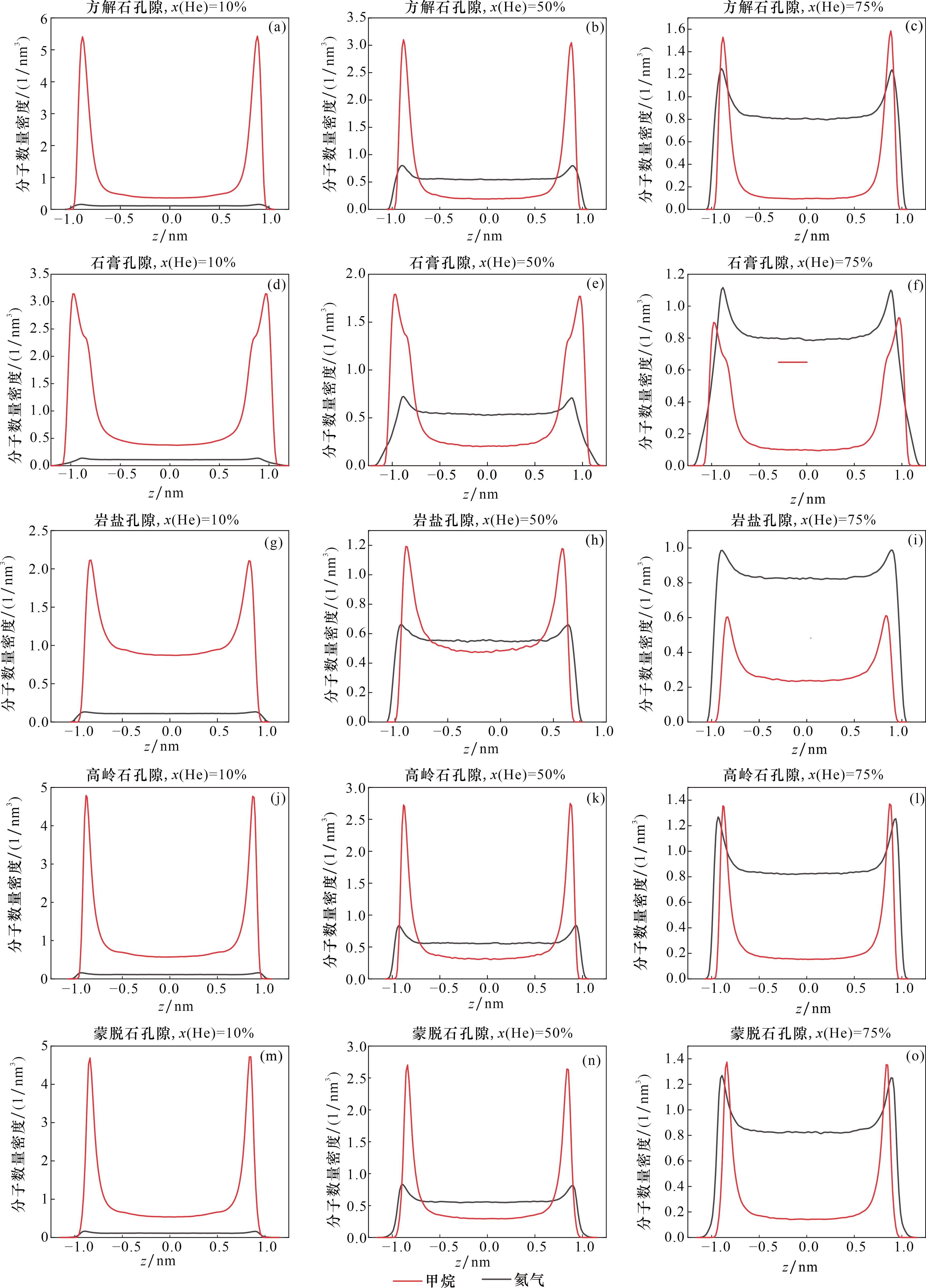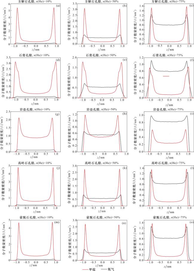 图9 几种盖层孔隙中氦气和甲烷沿z方向的分子数量密度分布[孔径为2 nm,总气压5 MPa。图中x(He)指氦气、甲烷混合气中氦气所占的体积比例]Fig.9 The molecular number density distribution of helium and methane along the z-direction in several caprock pores. [the pore size is 2 nm, and the total pressure is 5 MPa. In the figure, x(He) refers to the volume proportion of helium in the mixture of helium and methane] |
