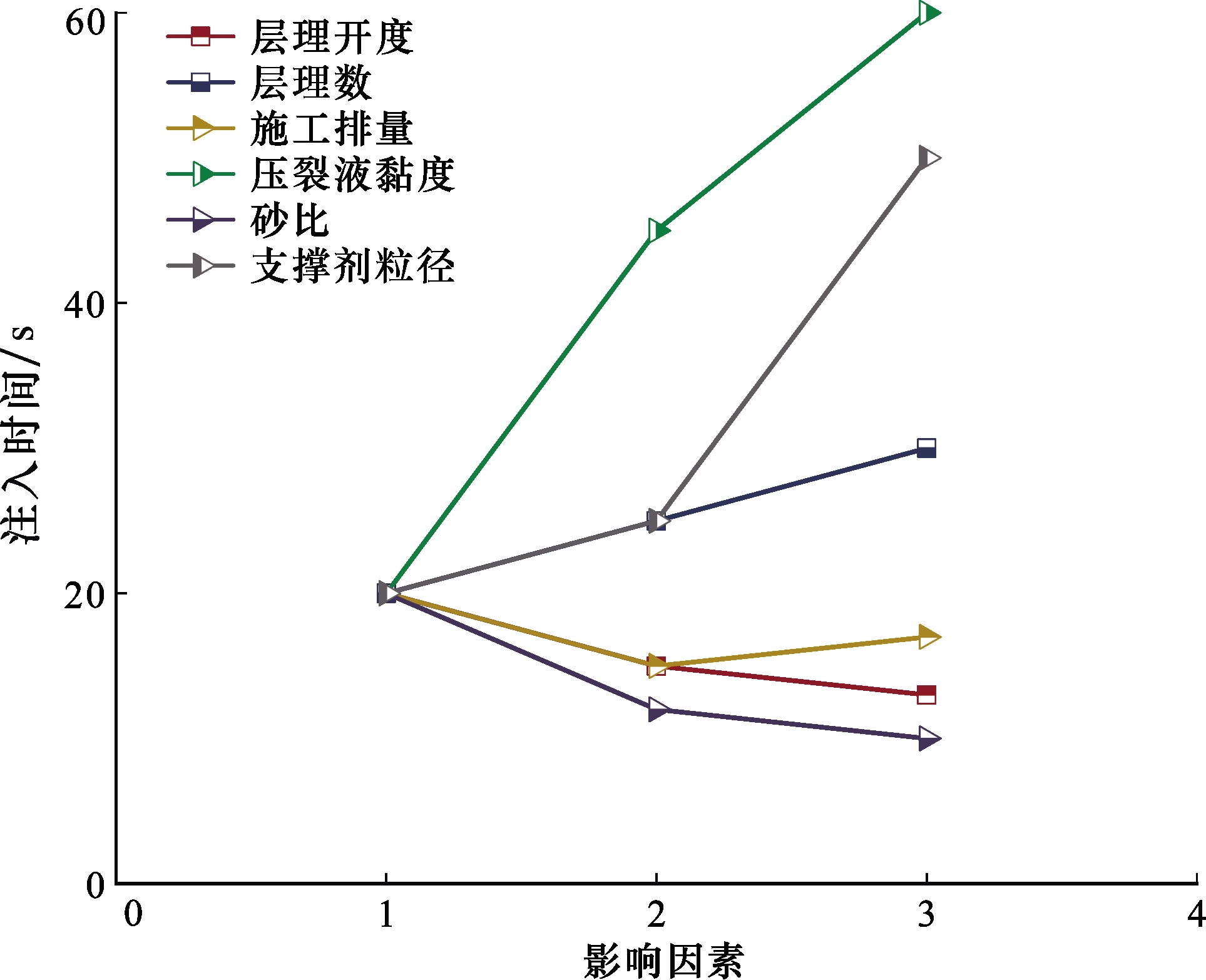 | 方案 | 施工排量 /(m3/min) | 压裂液黏度 /(mPa·s) | 砂比 /% | 支撑剂粒径/目 | 影响因素 |