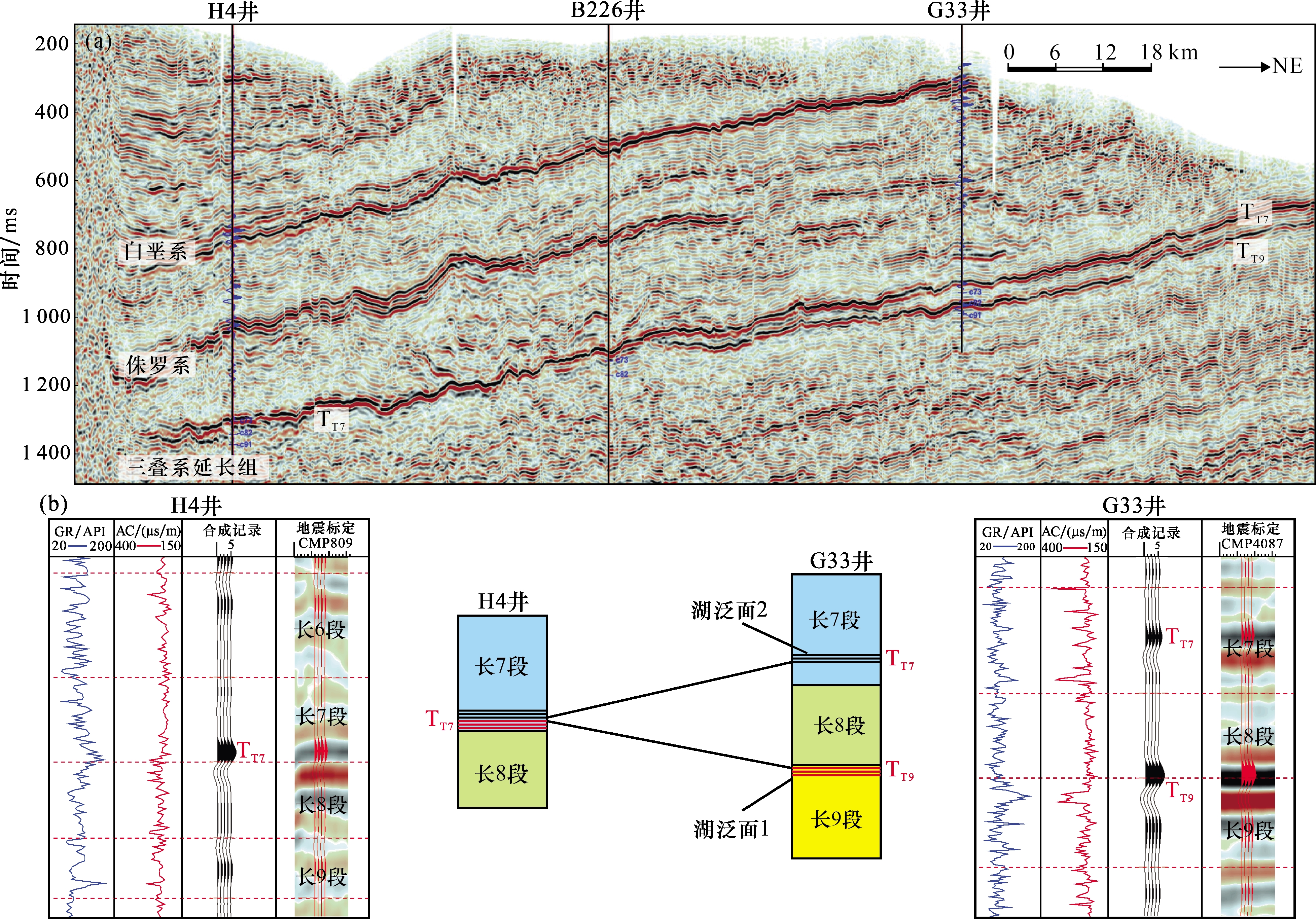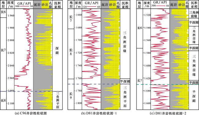 图6 延长组长7 段与长9 段湖泛面单井综合柱状图Fig.6 Comprehensive single-well columnar chart of the lake flooding surfaces in the Chang 7 and Chang 9 members of the Yanchang Formation |