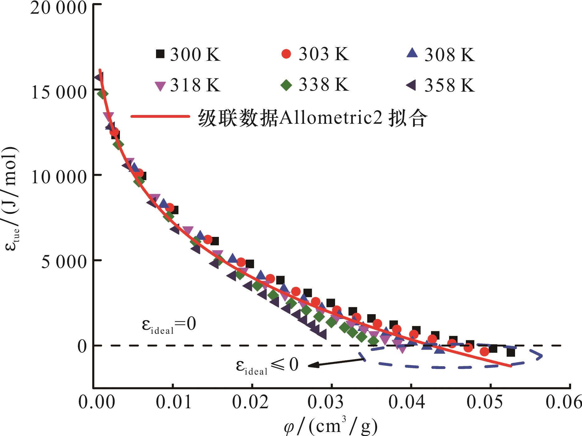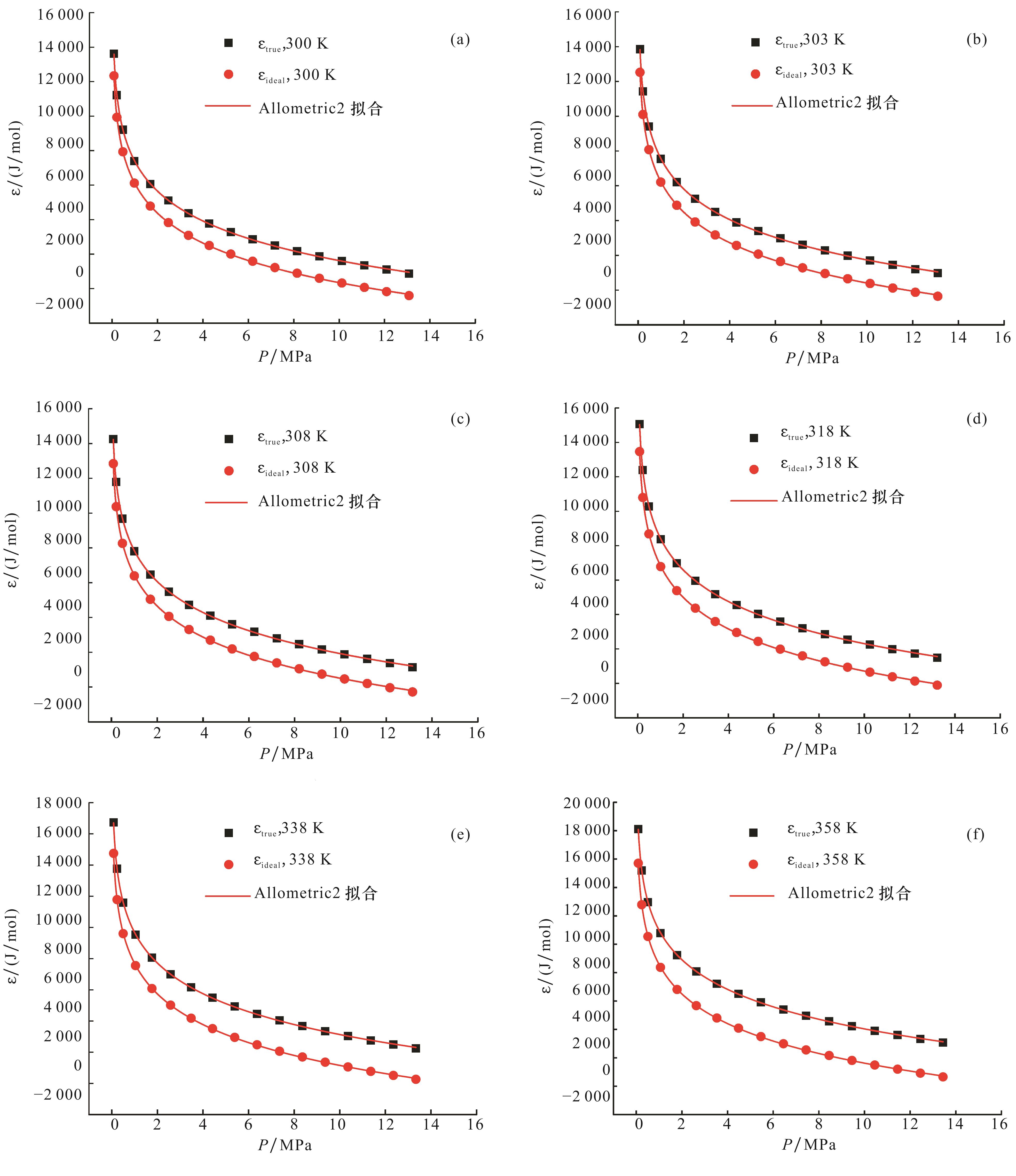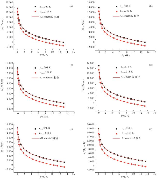 图11 不同温度下理想气体吸附势与超临界态气体吸附势曲线(a)300 K;(b)303 K;(c)308 K;(d)318 K;(e)338 K;(f)358 K Fig.11 Curves of ideal gas adsorption potential at different temperatures and supercritical state gas adsorption potential |