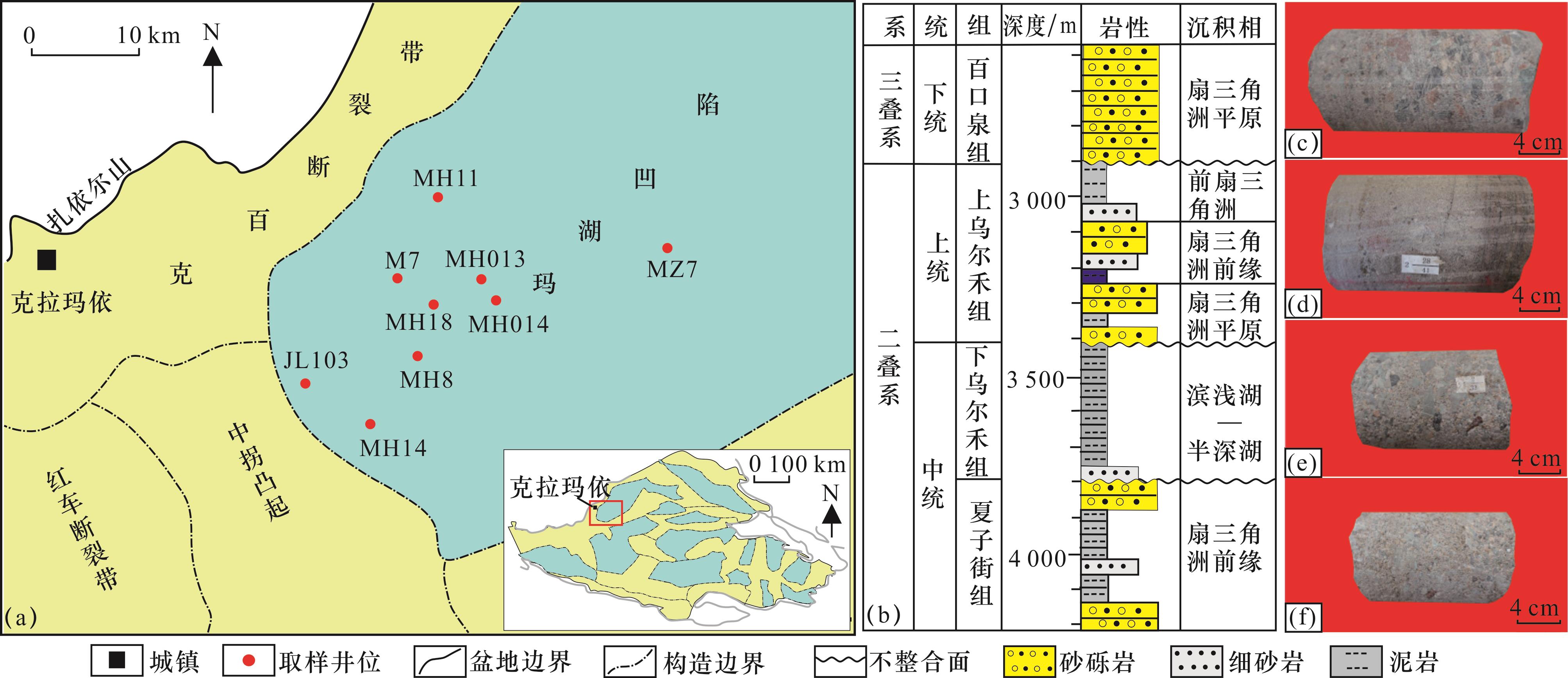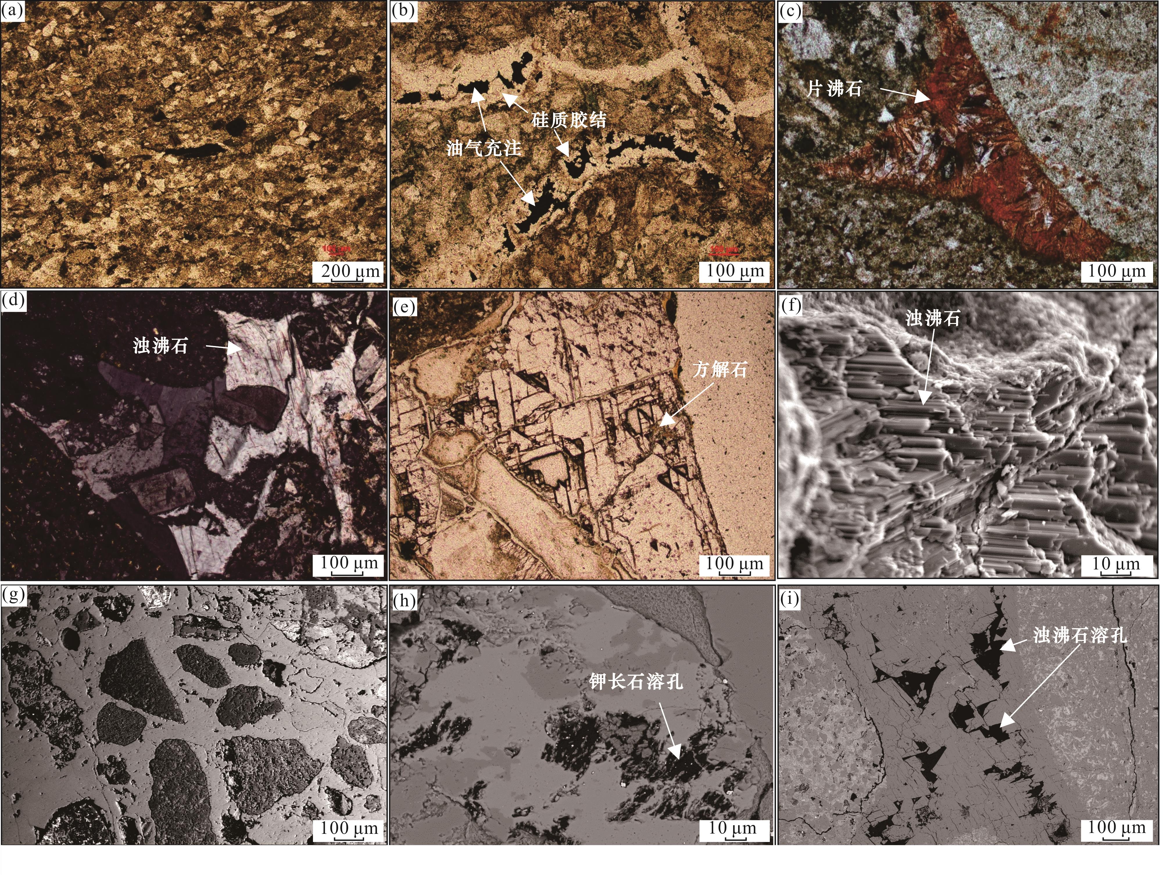 图2 准噶尔盆地玛南地区二叠系下乌尔禾组典型岩心显微图像(a)MH11井,3 370.25 m,碎屑颗粒压实定向,单偏光下图像;(b)MH11井,3 365.55 m,硅质胶结,油气充注,单偏光下图像;(c)MH14井,3 810.05 m,片沸石胶结,单偏光下图像;(d)MZ7井,4 463.05 m,浊沸石胶结,正交偏光下图像;(e)MH11井,3 235.89 m,方解石部分溶蚀,单偏光下图像;(f)MZ7井,4 466.55 m,浊沸石胶结,扫描电镜图像;(g)MH18井,3 686.4 m,方解石亮晶、连晶基底式胶结,电子探针BSE图像;(h)MH013井,3 589.5 m,钾长石溶蚀,电子探针BSE图像;(i)MH11井,3 462.9 m,浊沸石溶孔,电子探针BSE图像 Fig.2 Typical core microscopic images of Lower Wuerhe Formation of Permian in Ma’nan area, Junggar Basin |