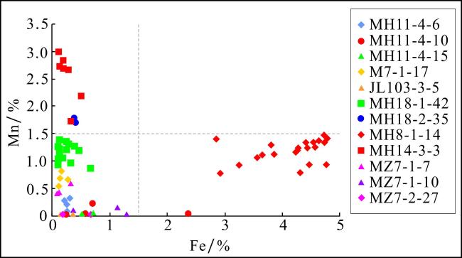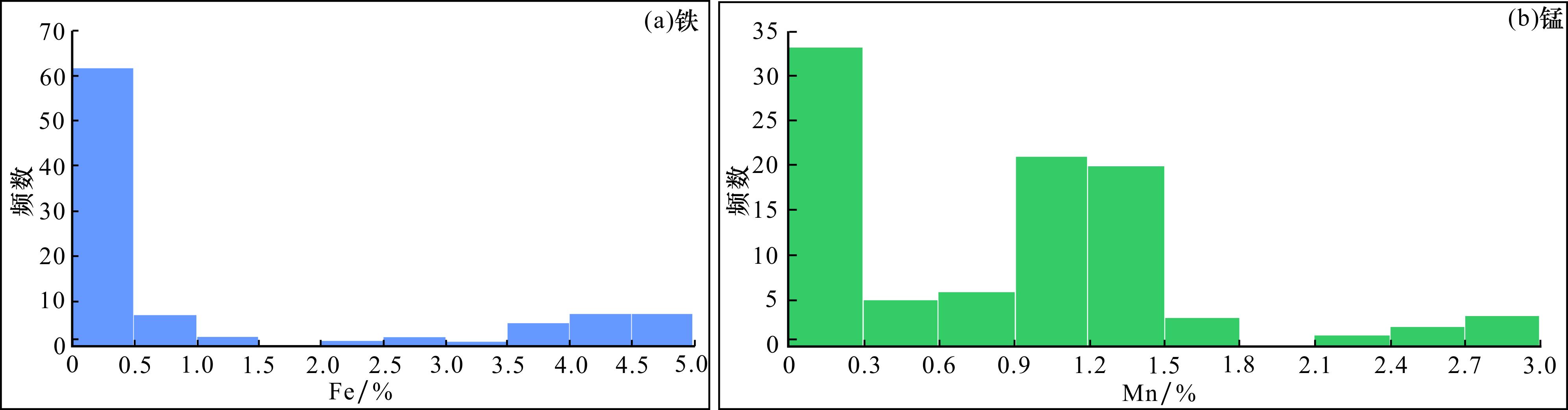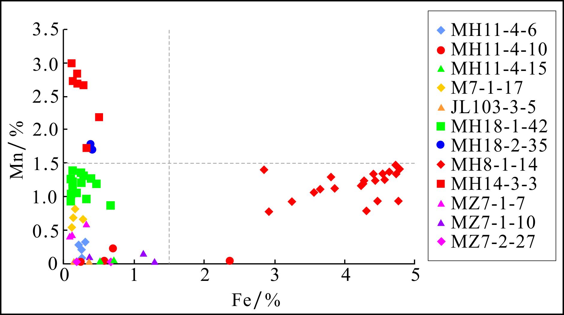 图3 准噶尔盆地玛南地区二叠系下乌尔禾组方解石中铁(Fe)、锰(Mn)元素含量(XRF)直方图Fig.3 Histogram of iron (Fe) and manganese (Mn) element contents (XRF) in calcite of the Lower Wuerhe Formation of Permian in the Ma’nan area, Junggar Basin |