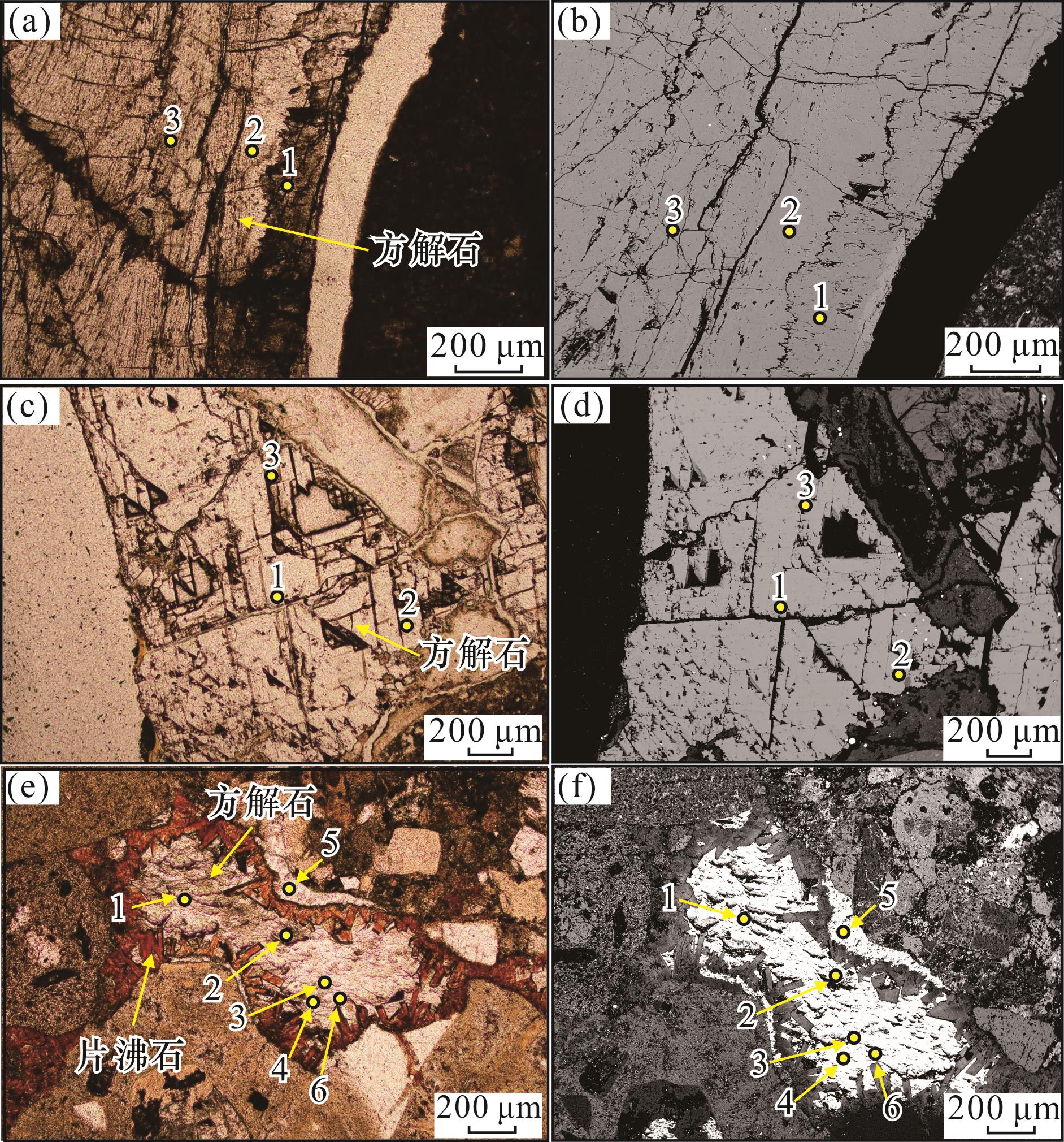 图5 准噶尔盆地玛南地区二叠系下乌尔禾组典型方解石胶结物显微图像及背散射(BSE)图像(a)MH18井,3 643.8 m,方解石胶结物,单偏光;(b)与(a)对应的BSE图像, BSE;(c)MH8井,3 350.45 m,方解石胶结物,单偏光;(d)与(c)对应的BSE图像;(e)MH14井,3 682.05 m,橘红色环带为方沸石,环带内亮白色为方解石,单偏光;(f)与(e)对应的BSE图像.以上图像中黄点表示电子探针化学元素测试点 Fig.5 Microscopic and BSE images of typical calcite cements in the Lower Wuerhe Formation of the Permian in the Ma’nan area of the Junggar Basin |