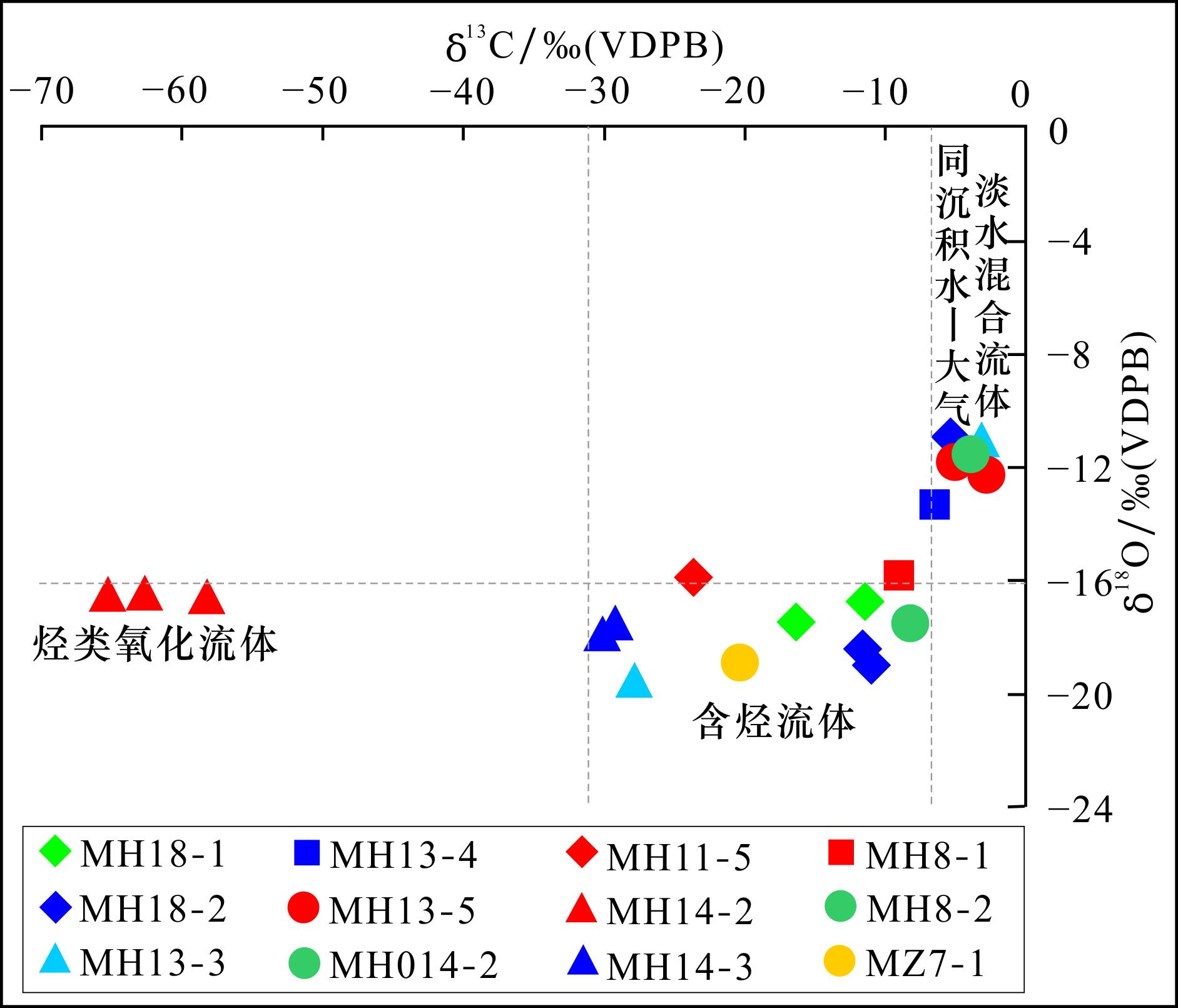 | 同沉积水—大气淡水混合流体 | MH18 | 3 643.80 | -3.8 | -11.5 | 5.5 |