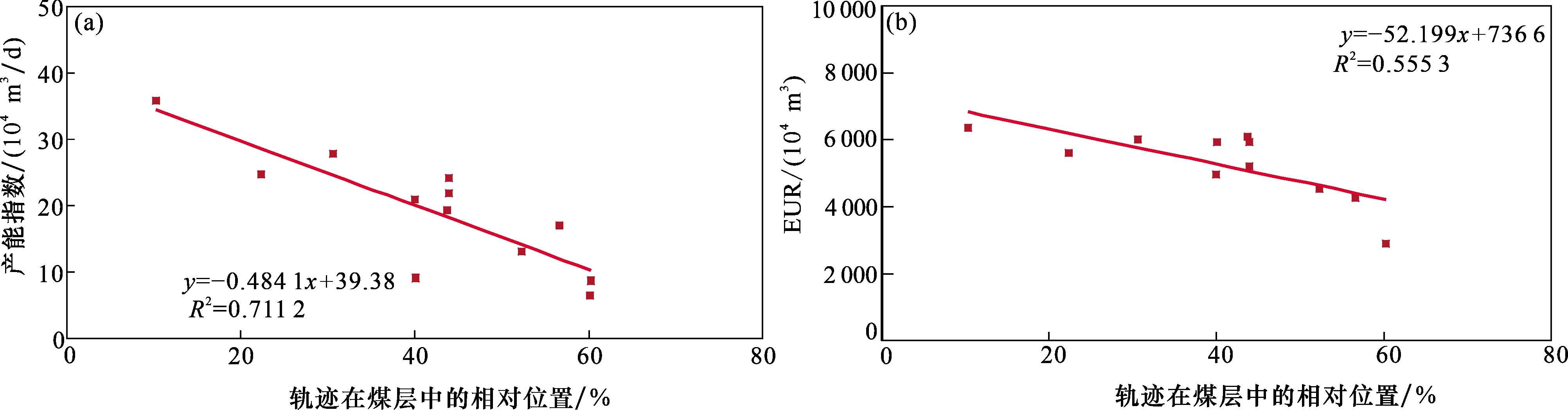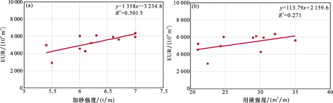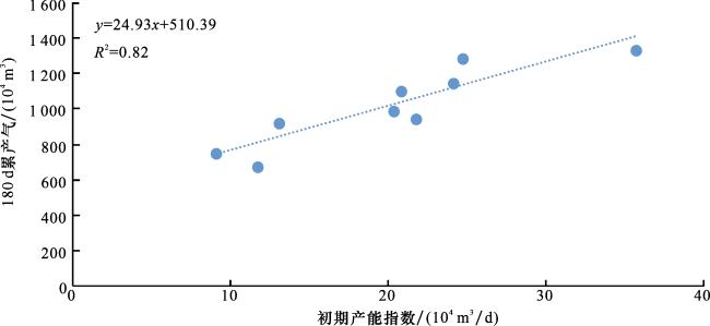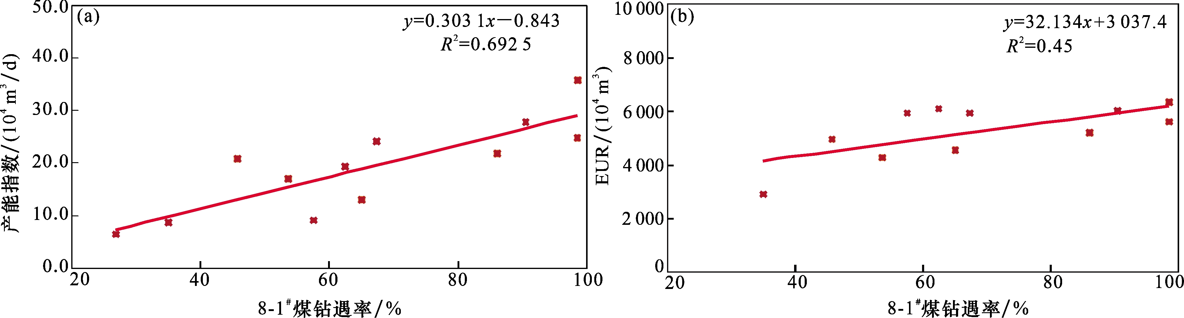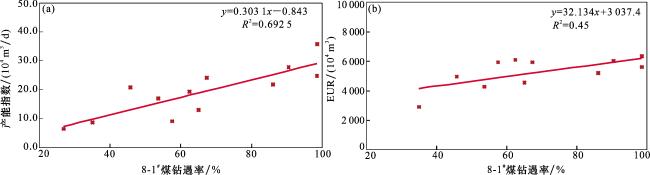 图9 佳县地区8-1 # 煤钻遇率与产能指数、EUR交会图(a)佳县地区8-1#煤钻遇率与产能指数交会图;(b) 佳县地区8-1#煤钻遇率与EUR交会图 Fig. 9 Intersection chart of 8-1 # coal drilling encounter rate, production capacity index, and EUR in Jiaxian area |