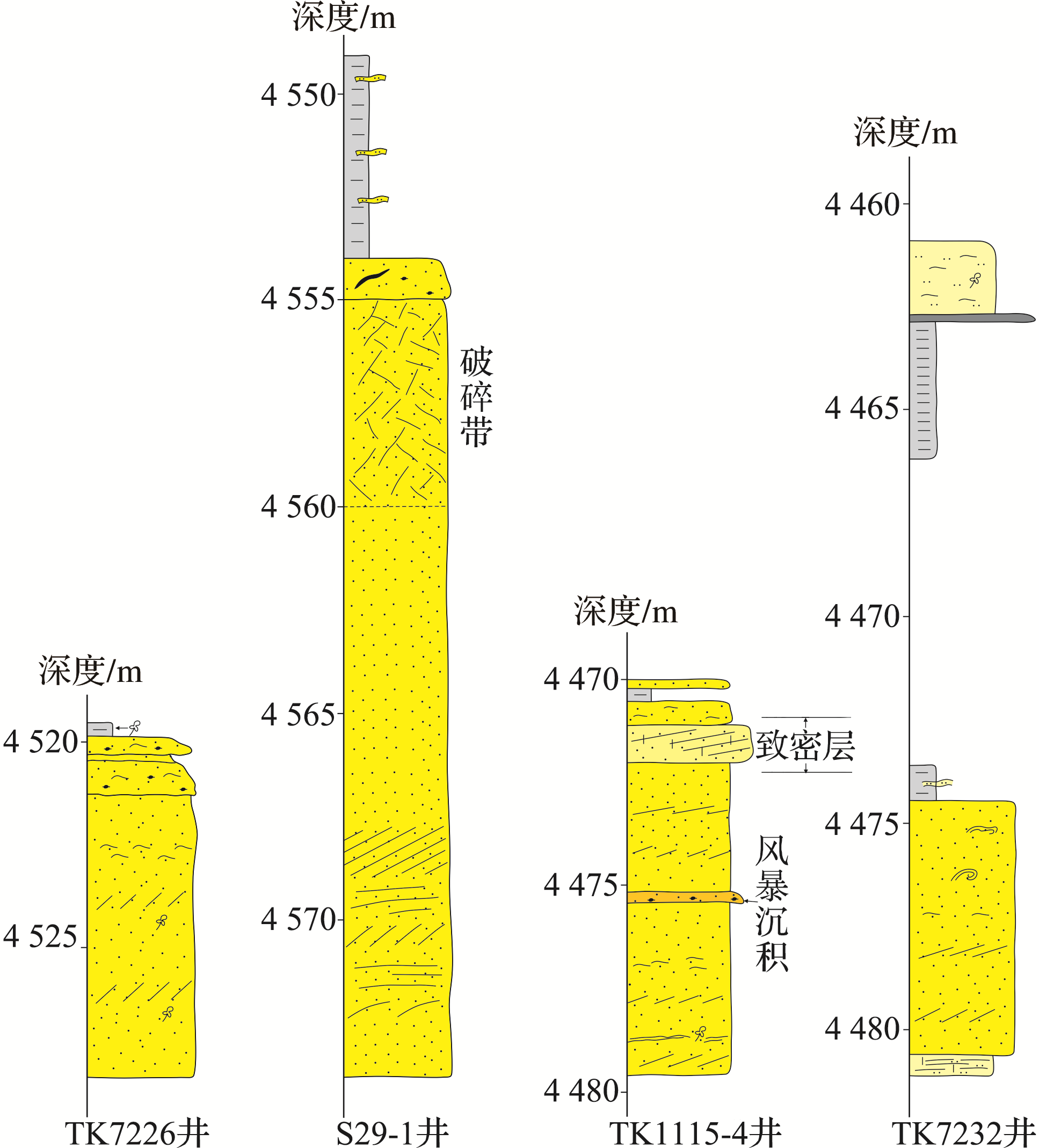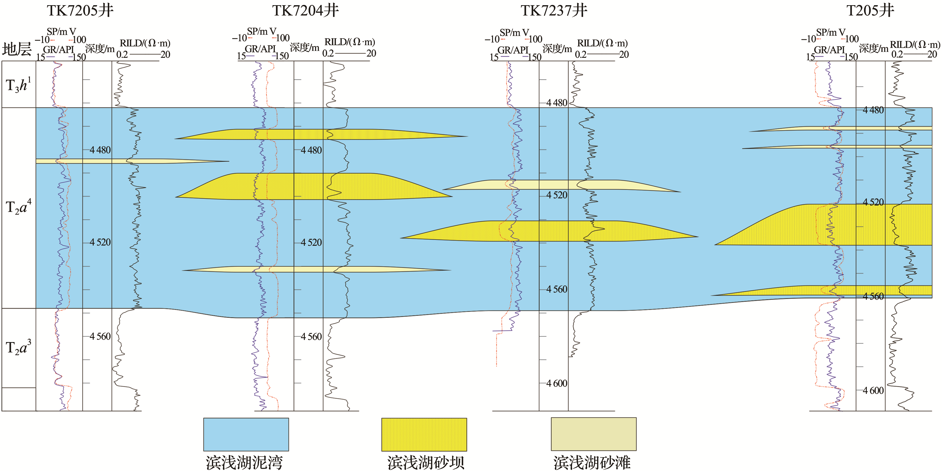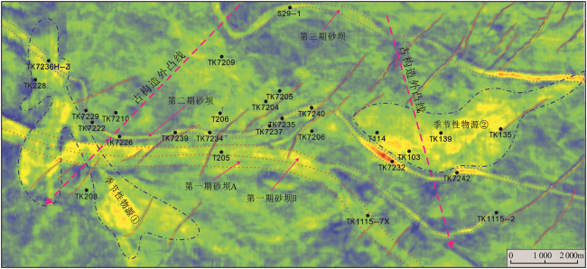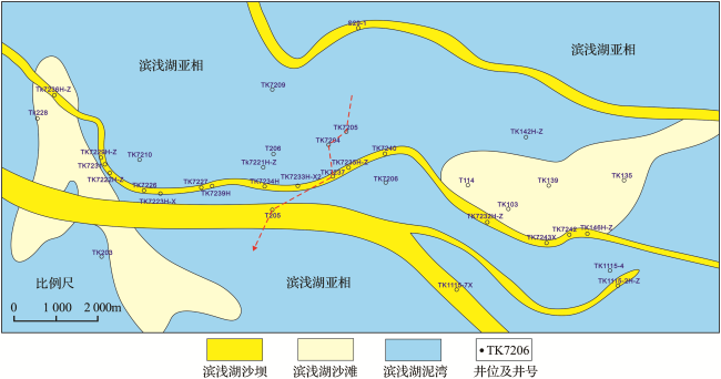 图7 塔河地区东部三叠系阿四段南北向连井剖面Fig.7 The north-south well-tie sections in the fourth member of Akekule Formation, east of Tahe Oilfield |