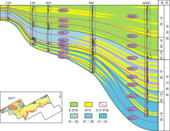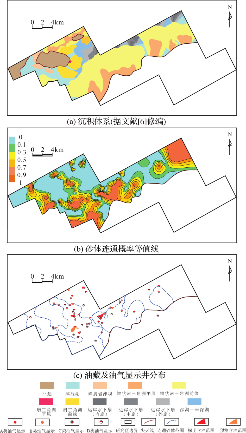 图5(c)]。研究区河口坝砂体较水下分流河道砂体更为发育,常出现多期河口坝的叠加,叠加厚度较大,甚至可达到10m以上。因此,河口坝砂体为研究区优势输导砂体类型,水下分流河道砂体连通性及物性较强,但是发育范围及规模不及河口坝砂体。席状砂砂体虽然连通性及物性相对较差,但是分布范围相对较广。三角洲前缘席状砂砂体决定了输导通道的分布范围,河口坝砂体及水下分流河道砂体决定了优势输导通道的分布范围。