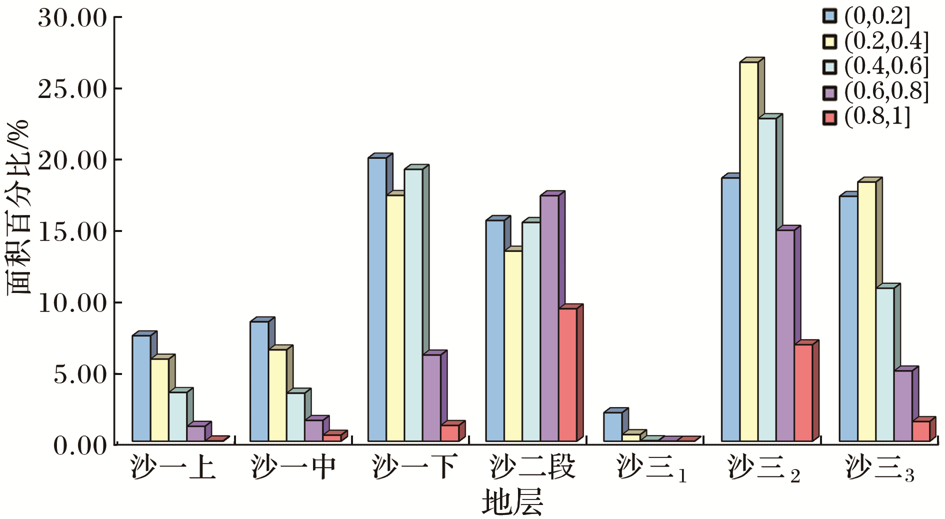 研究区三角洲前缘水下分流河道砂体岩性主要为砂砾岩及含砾不等砾砂岩,块状构造,一般无明显的岩性界面,沉积砂岩段厚度较大,孔隙度、渗透率较高,但是整体分布范围不大,油气显示较好,可见油斑、荧光。通过对11口井287个水下分流河道砂体统计结果发现,研究区水下分流河道砂体厚度约为6m,孔隙度约为5.3%~33.9%,平均为17.6%;渗透率约为(0.1~1 128)×10