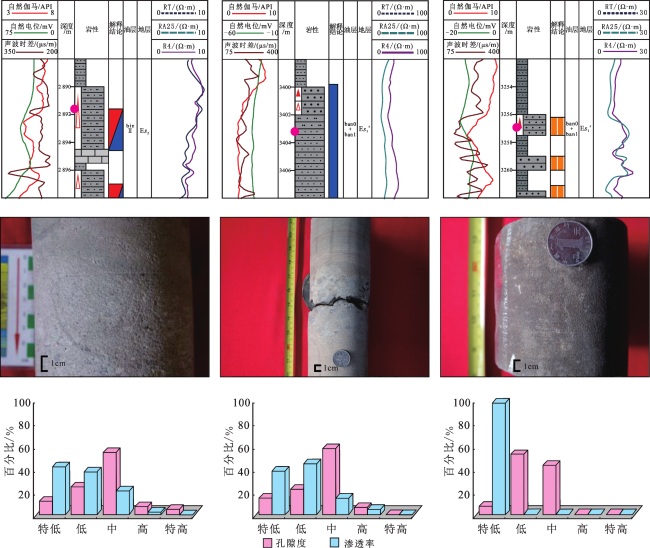 图5(b)]。三角洲前缘席状砂砂体沉积厚度不大(大约为1m),油气显示以荧光为主。孔隙度、渗透率较高以中、低孔、特低渗为主。通过对1口井31个河口坝砂体统计结果发现,研究区席状砂体单期厚度约为1.5m,孔隙度约为9.4%~18.6%,平均为14.3%;渗透率约为(0.5~7)×10