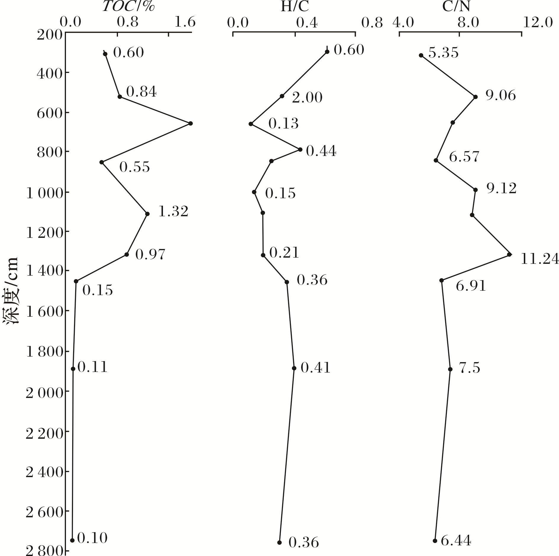图5 江汉盆地监利县第四纪地层总有机碳含量(TOC)、氢碳比值(H/C)和碳氮比值(C/N)随深度变化关系(改自文献[27]) Fig.5 Relationship between total organic carbon content(TOC), hydrogen-carbon (H/C)ratio and carbon-nitrogen (C/N) ratio as a function of depth in the Holocene strata in the Jianli county, Jianghan Basin (modified from the Ref.[27]) |