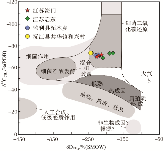 图3 江汉盆地南部监利地区浅层生物气成因类型(底图修改自文献[23])Fig.3 Origin types of shallow biogenic gas samples from the southern part of the Jianghan Basin (diagram modified from the Ref.[23]) |