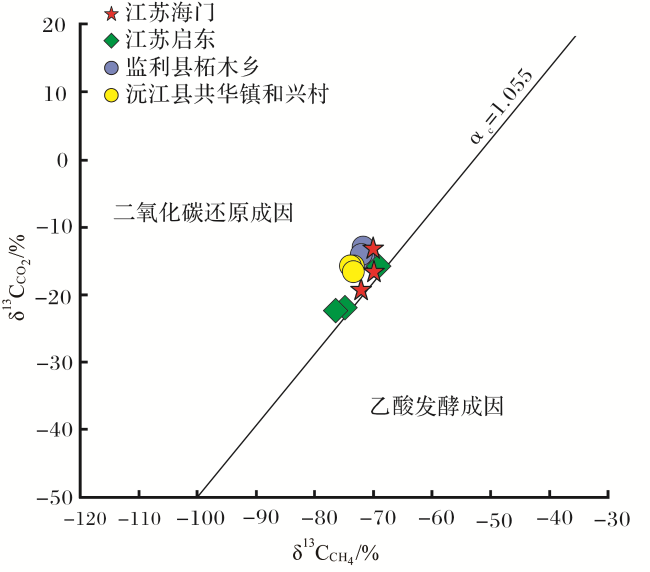 表2 江汉—洞庭盆地及江浙沿海平原浅层天然气碳氢同位素组成特征Table 2 Characteristics of carbon and hydrogen isotopes of shallow gas in the Jianghan-Dongting Basins and the Jiangsu-Zhejiang coastal plains |