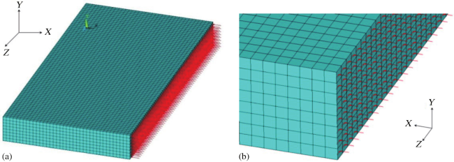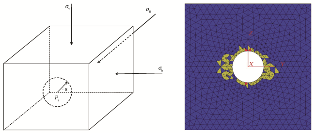 图17 断层面受力图(图中网格为数值计算划分的网格,红色箭头为力,垂直断层面为挤压力,平行断层面为剪切力)Fig.17 Force diagram of fault plane (The grid cuts the formation into discrete blocks for mumerical computation, the red arrows areforces acting on fault plane, the perpendicular arrow is compressive forcenormal pressure, and the parallel arrow is shear stress) |