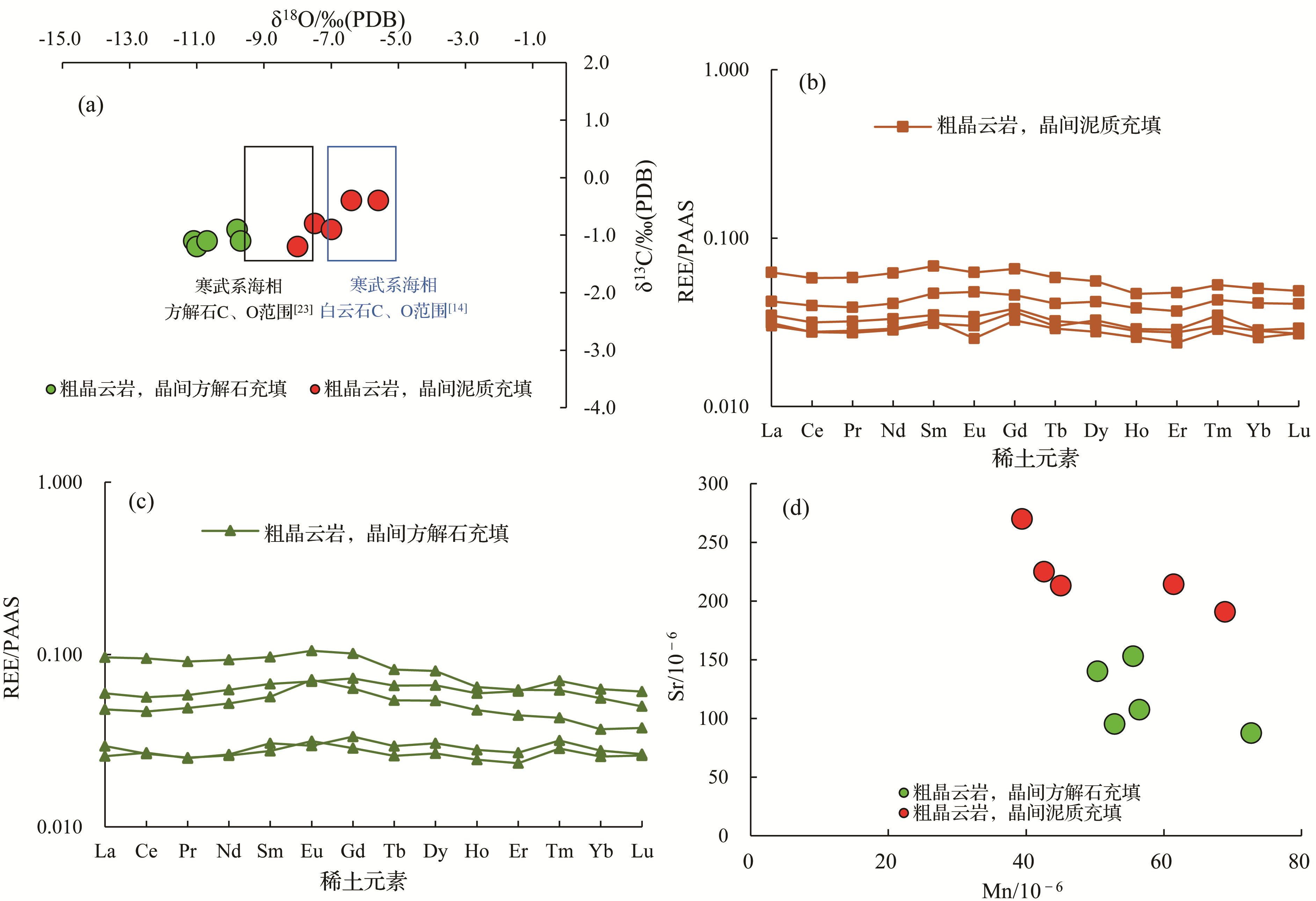 | GC15-1 | 粗晶云岩,晶间方解石充填 | -0.90 | -9.80 | 0.709 105 |